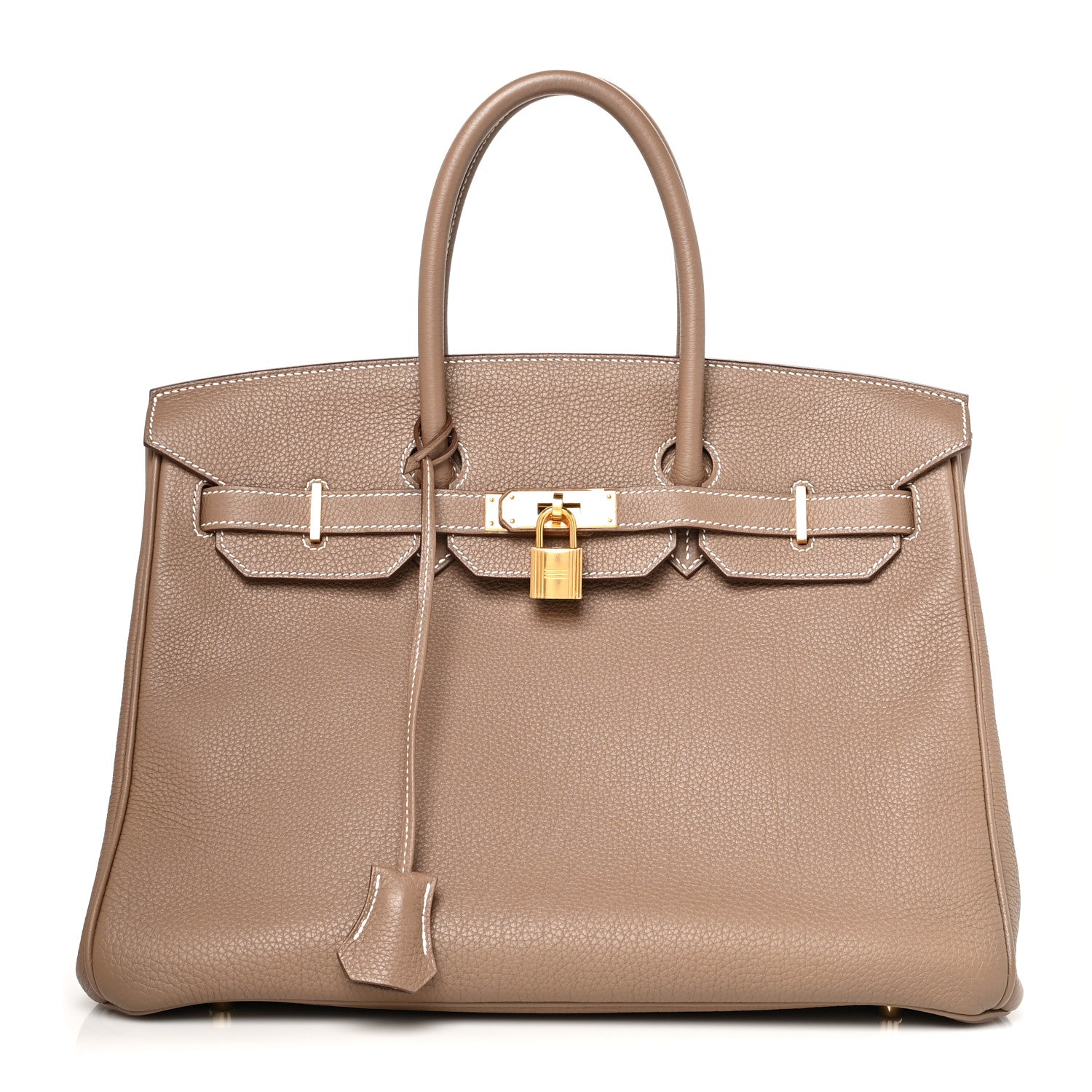 This is an authentic HERMES Togo Birkin 35 in Etoupe. This iconic handbag is finely crafted of grained calfskin leather in taupe. The bag features rolled leather top handles, a leather belt and polished palladium plated hardware, including a turn lock, a padlock and a hanging clochette with keys. The front flap opens to a matching goatskin leather interior with zipper and patch pockets.Follow this item for alerts. Hermes is a registered trademark of Hermes. FASHIONPHILE is not affiliated with Hermes.