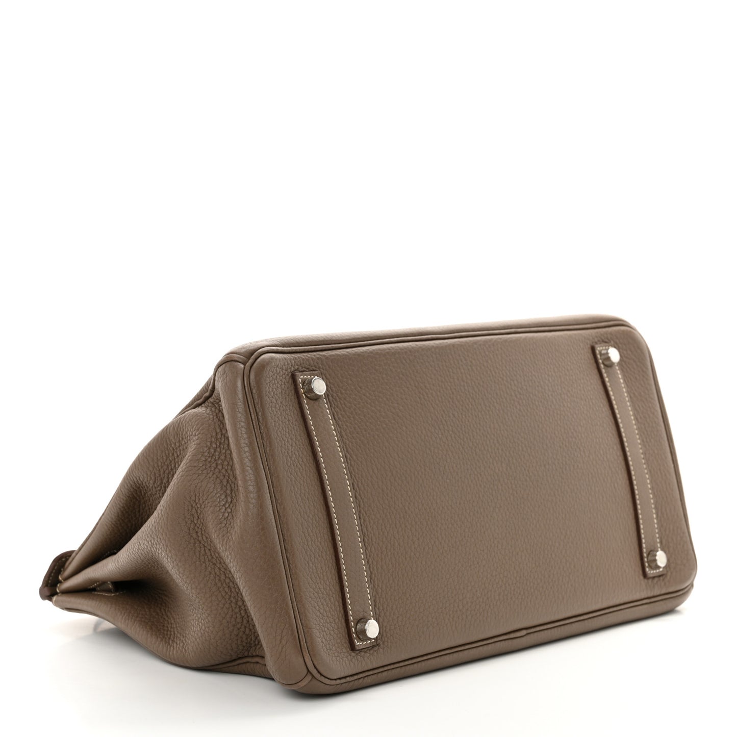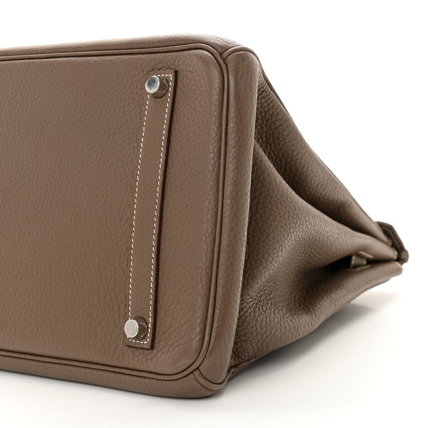 This is an authentic HERMES Togo Birkin 35 in Etoupe. This iconic handbag is finely crafted of grained calfskin leather in taupe. The bag features rolled leather top handles, palladium silver plated hardware. The front flap opens to a matching goatskin leather interior with zipper and patch pockets.Follow this item for alerts. Hermes is a registered trademark of Hermes. FASHIONPHILE is not affiliated with Hermes.