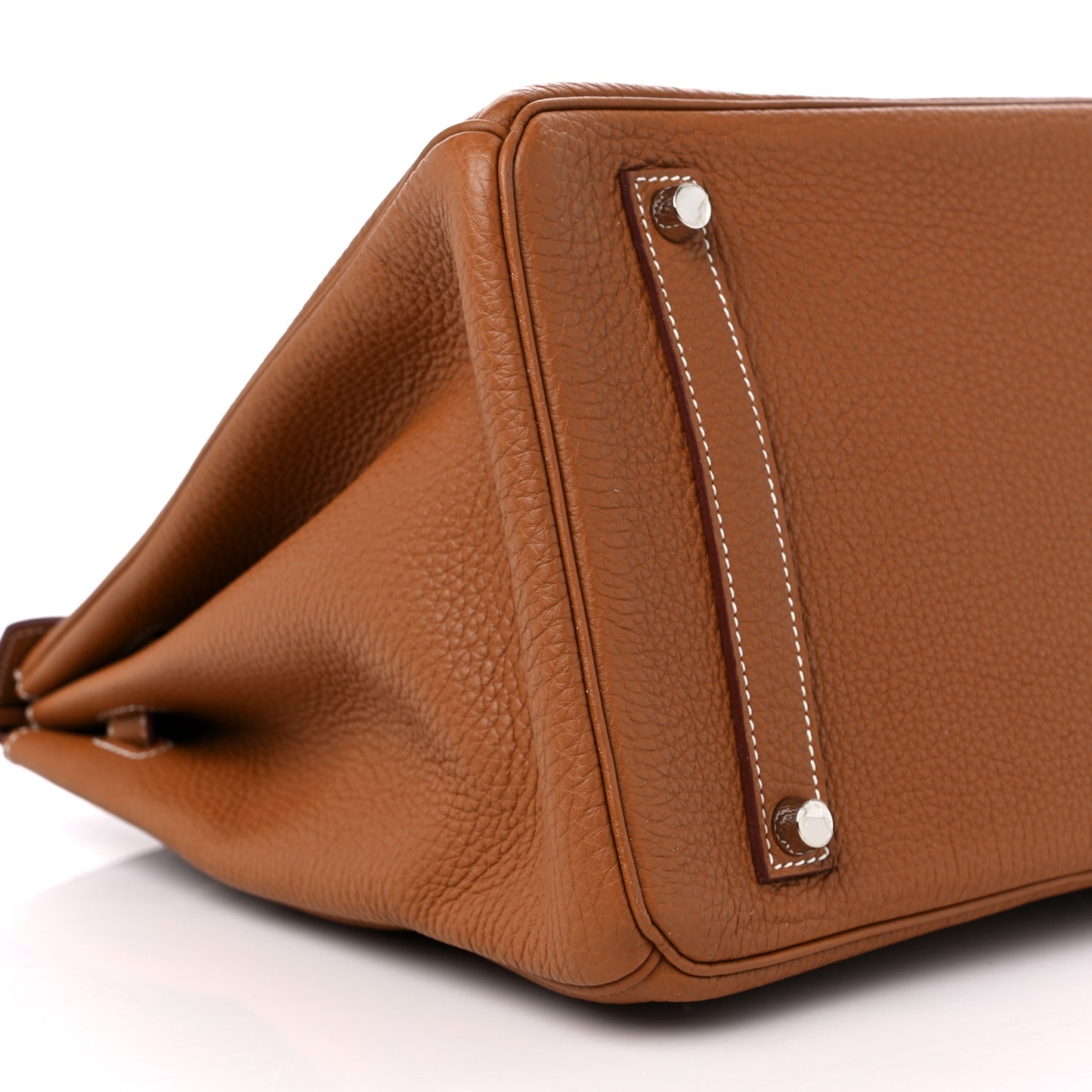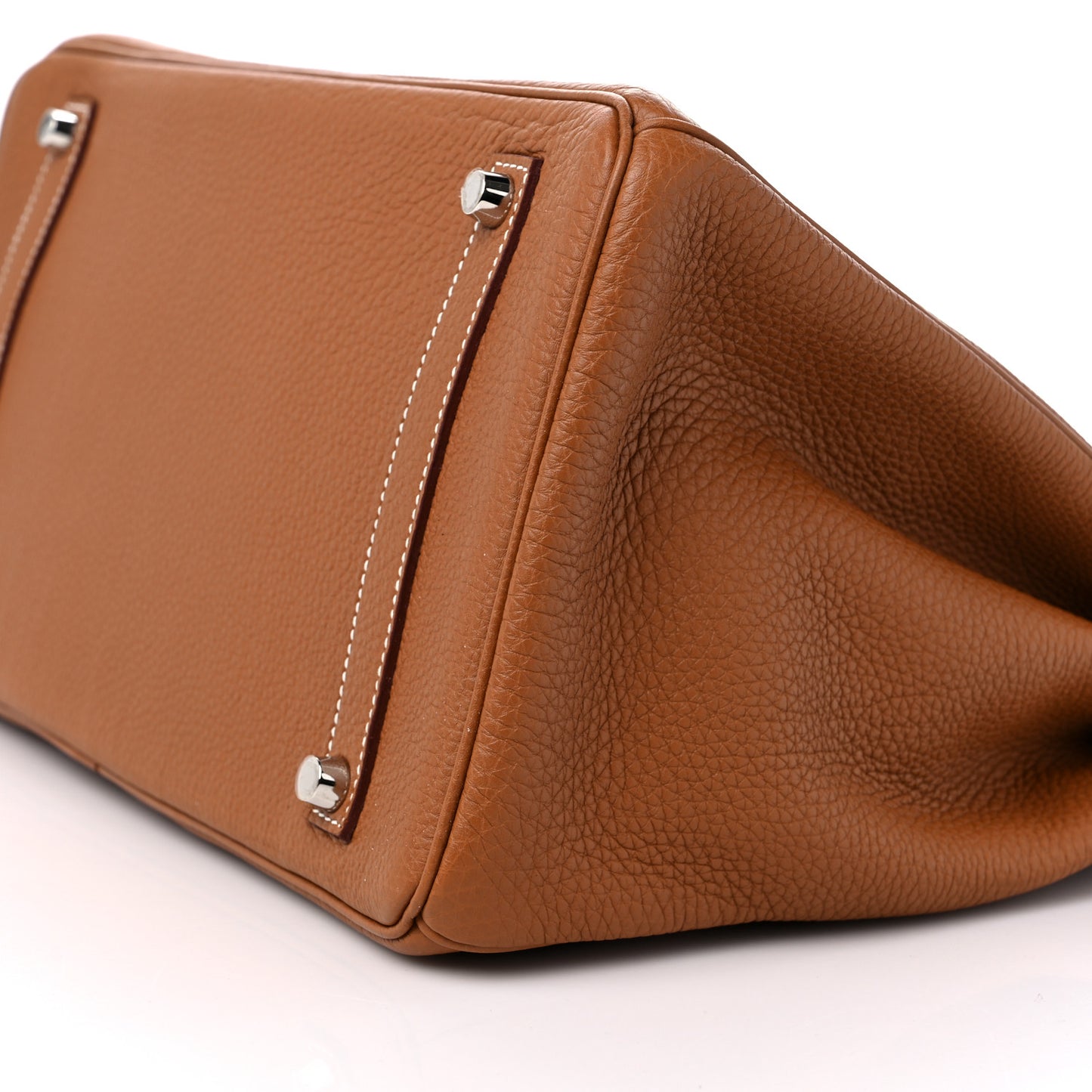 This is an authentic HERMES Togo Birkin 35 in Gold. This sophisticated handbag is finely crafted of grained togo leather in a classic camel brown with white contrast stitching. This iconic handbag features rolled leather top handles, a front flap with strap closure, and polished palladium hardware. The top flap opens to a matching brown chèvre leather interior with zipper and patch pockets.Follow this item for alerts. Hermes is a registered trademark of Hermes. FASHIONPHILE is not affiliated with Hermes.