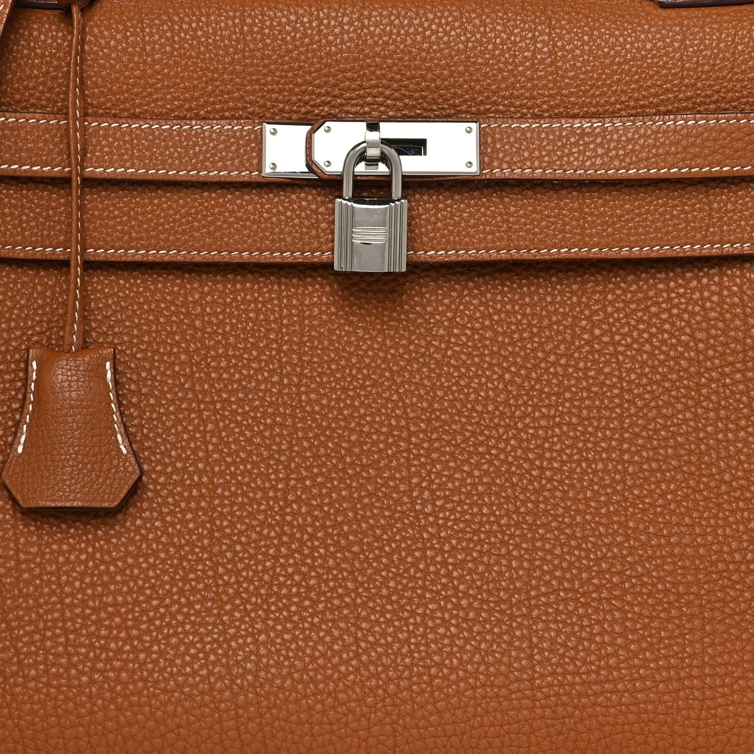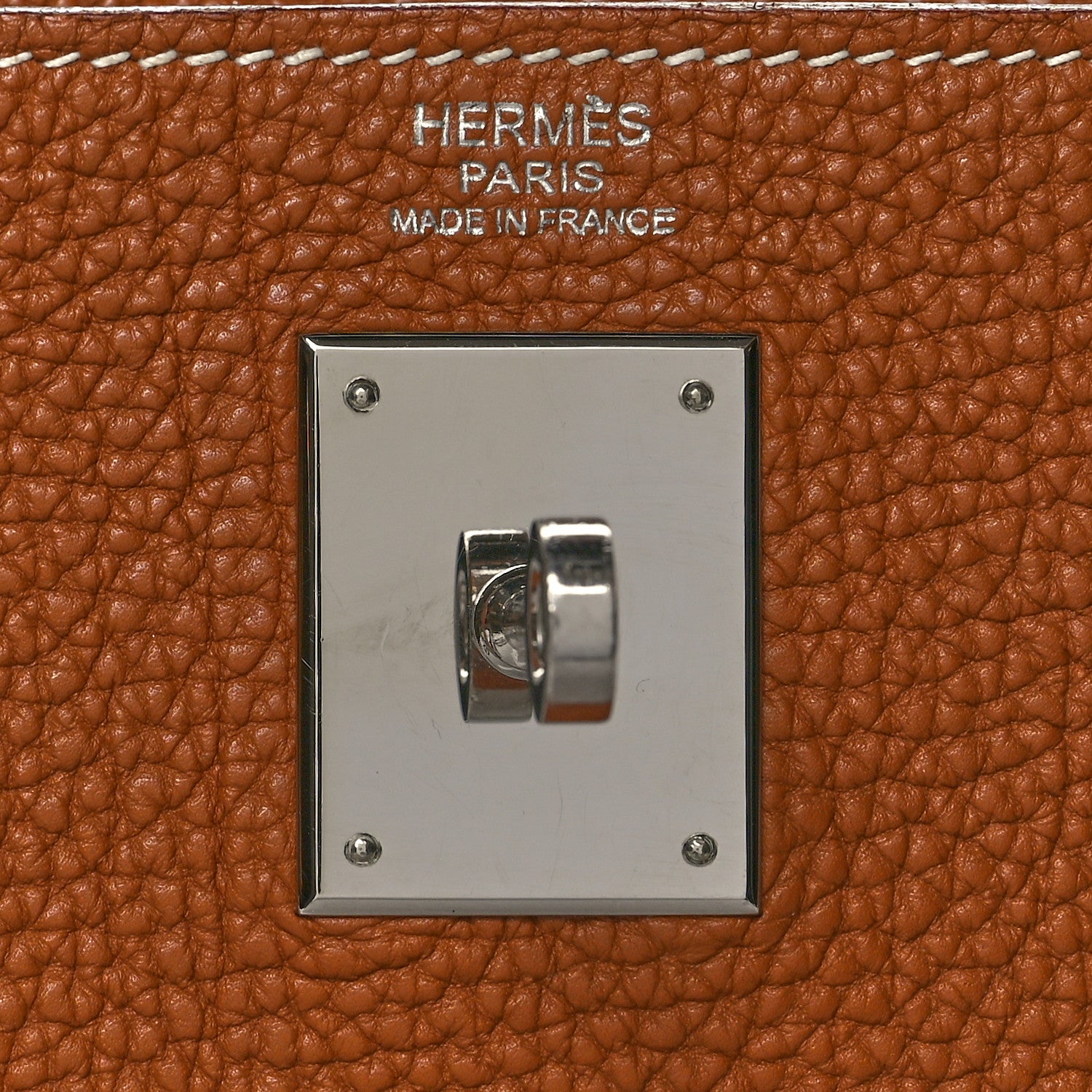 This is an authentic HERMES Togo Kelly Retourne 32 in Gold. This handbag is crafted of richly textured calfskin leather in a beautiful shade of golden brown. The bag features a reinforced leather top handle, an optional leather shoulder strap with silver palladium hardware, and a short crossover flap, secured with a strap and Kelly turn lock closure. The bag opens to a matte leather interior with a zipper and flat pockets.Follow this item for alerts. Hermes is a registered trademark of Hermes. FASHIONPHILE is not affiliated with Hermes.