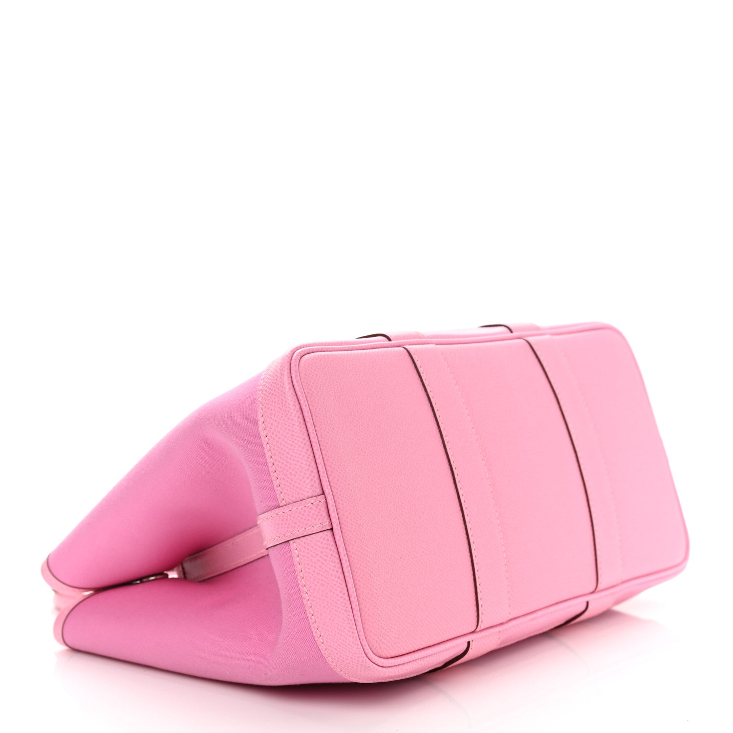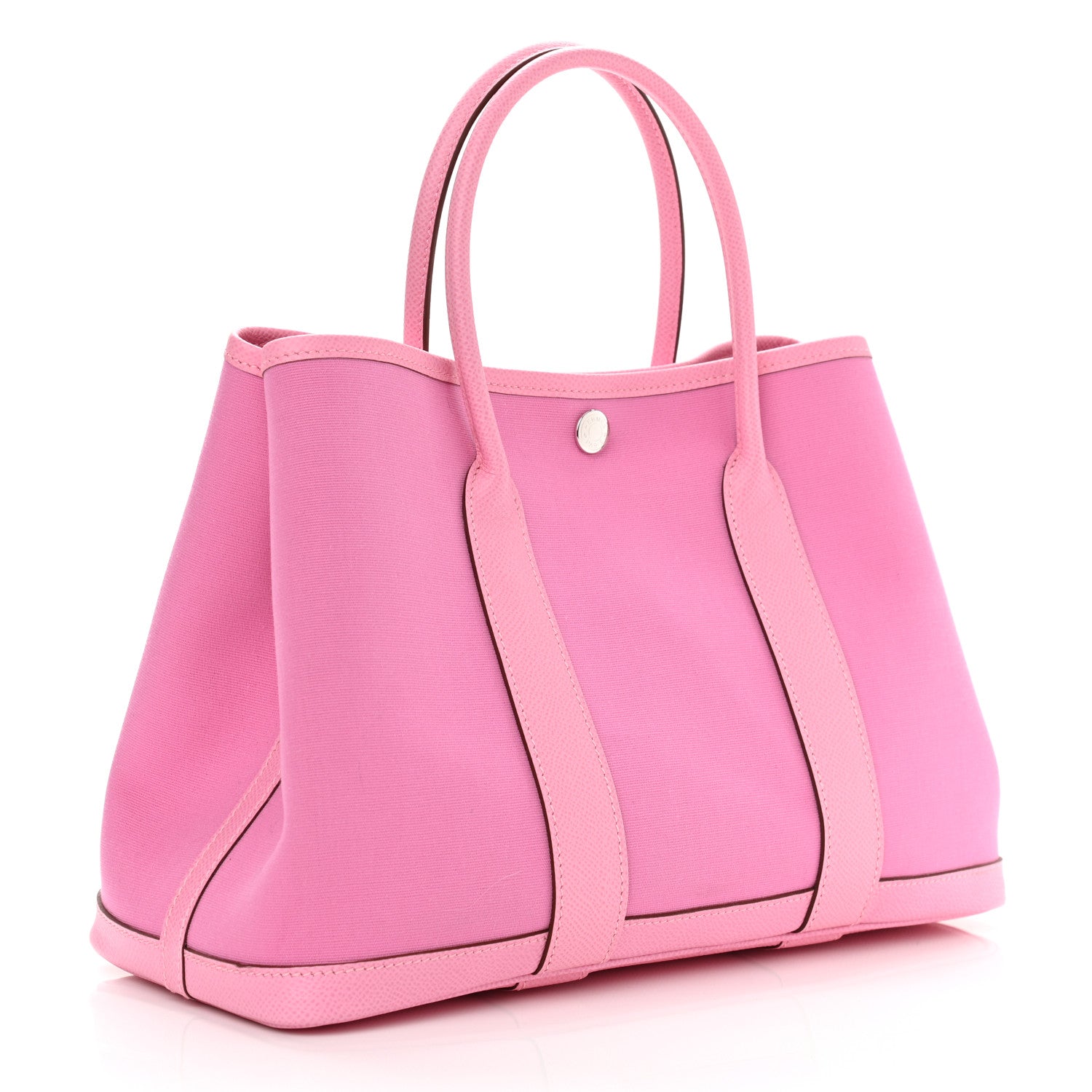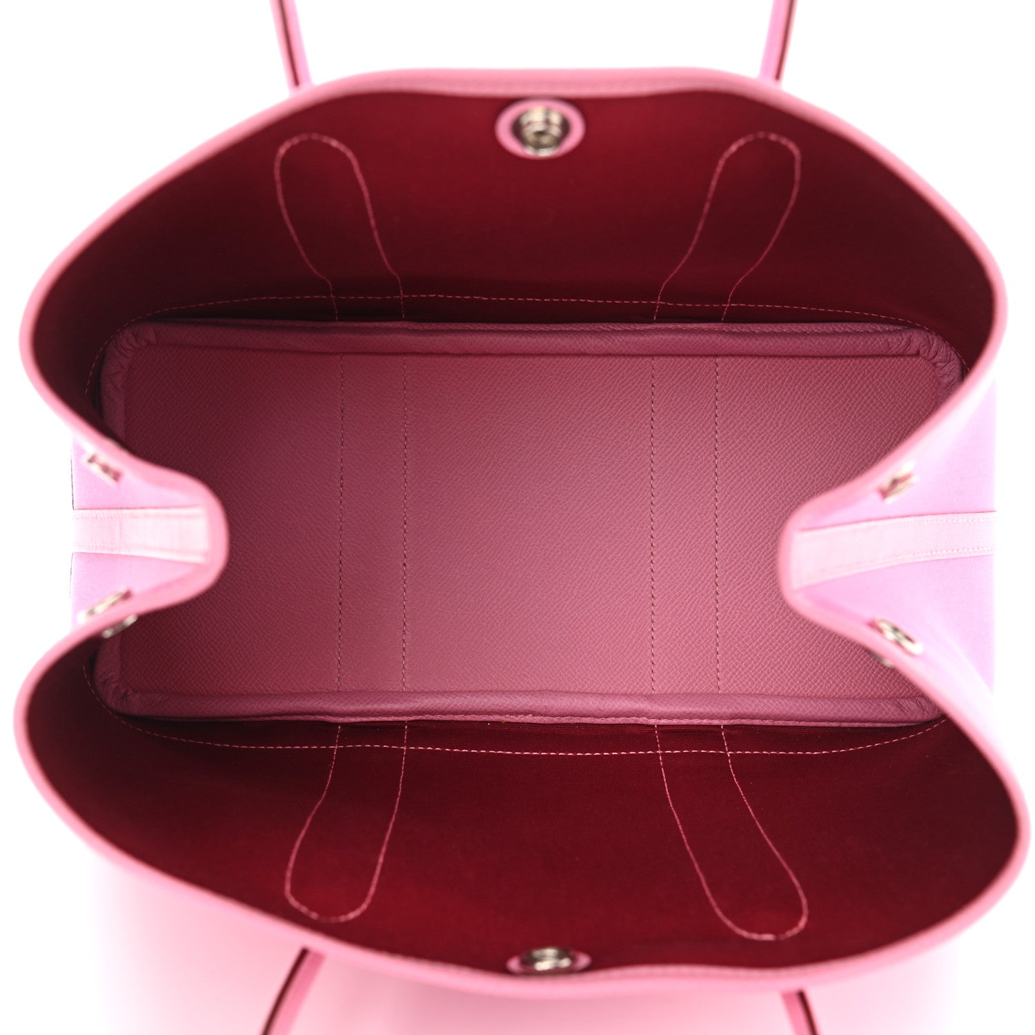 This is an authentic HERMES Toile Epsom Verso Garden Party 30 TPM in Bubblegum and Rubis. This is a beautiful Hermes tote constructed of pink canvas that is durable and strong. This is reinforced with pink leather including a solid leather base and sides that extend into top rolled handles. There is a silver snap top closure that leads to a burgundy canvas interior.Follow this item for alerts. Hermes is a registered trademark of Hermes. FASHIONPHILE is not affiliated with Hermes.
