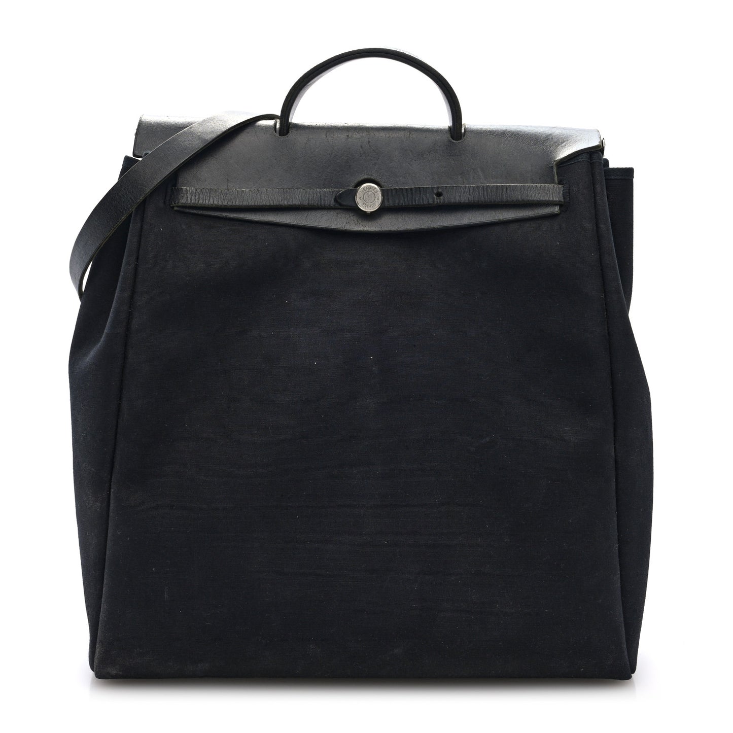 This is an authentic HERMES Toile Vache Calfskin Herbag 40 GM in Black. This bag is crafted of black toile canvas. The bag features a black leather crest with leather top handles and palladium silver hardware. The interior is black fabric.Follow this item for alerts. Hermes is a registered trademark of Hermes. FASHIONPHILE is not affiliated with Hermes.