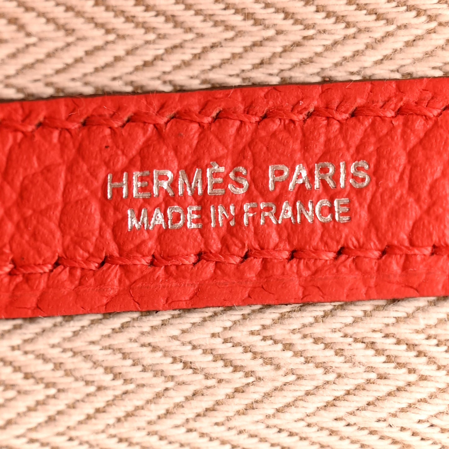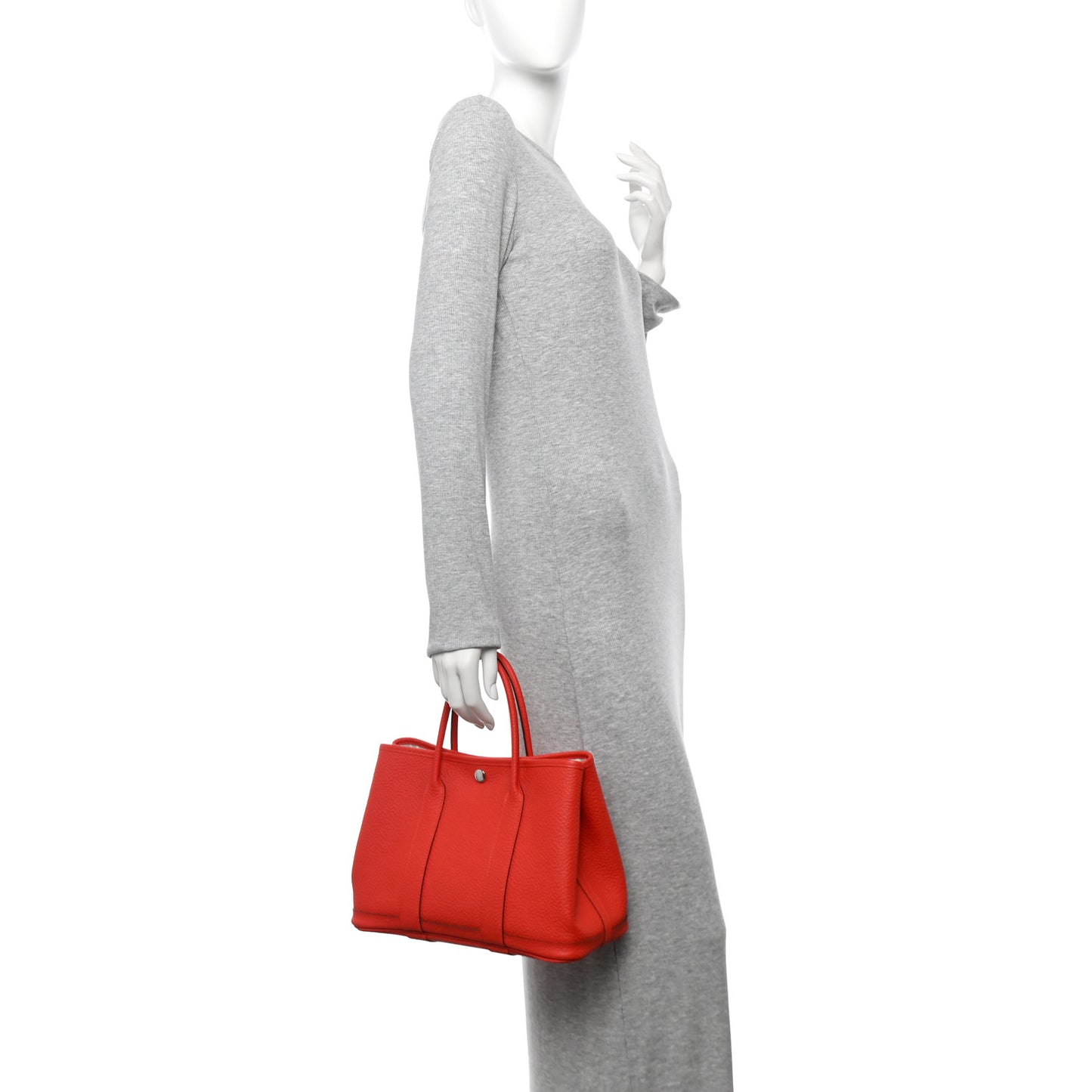This is an authentic HERMES Vache Country Garden Party TPM 30 in Rouge Tomate. This sophisticated tote is crafted of textured matte leather in a beautiful shade of red. The bag features rolled leather top handles that extend into a decorative trim and silver palladium hardware. The top snaps opens to an ivory herringbone fabric interior with a zipper pocket.Follow this item for alerts. Hermes is a registered trademark of Hermes. FASHIONPHILE is not affiliated with Hermes.