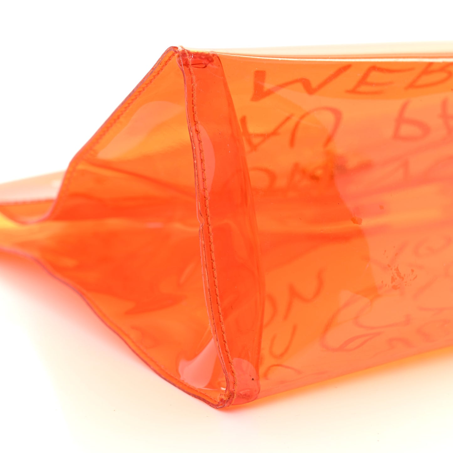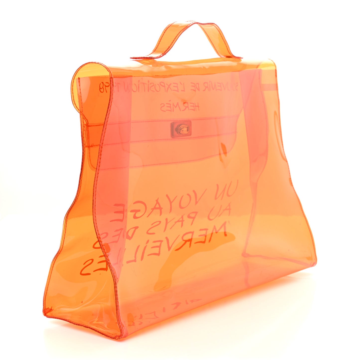 This is an authentic HERMES Vinyl Souvenir De L'Exposition Kelly in Orange. This bag is made of transparent orange vinyl with contrasting white text. It features a top handle and a Kelly style turn lock.Follow this item for alerts. Hermes is a registered trademark of Hermes. FASHIONPHILE is not affiliated with Hermes.