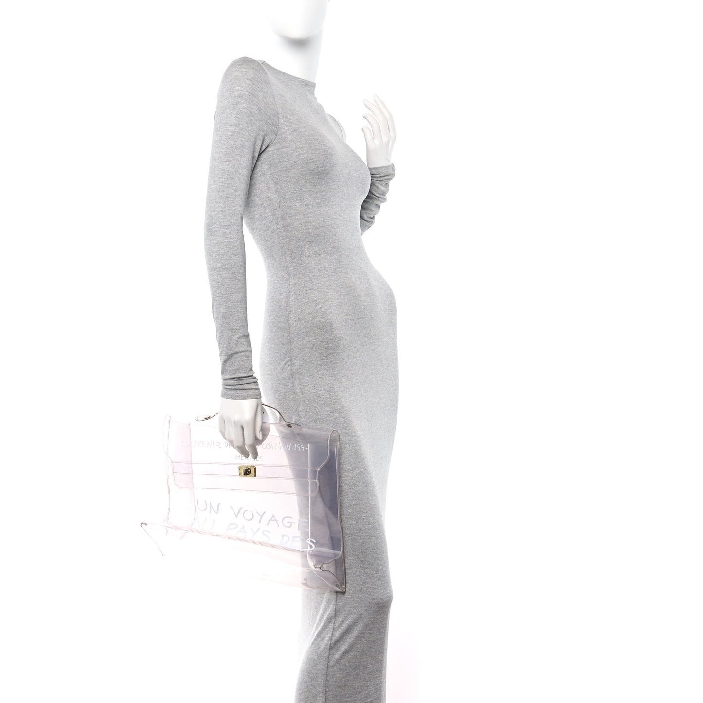This is an authentic HERMES Vinyl Souvenir De L'Exposition Kelly in Transparent. This tote is crafted of transparent vinyl and features voyage lettering on the front. There is a top handle and a cross-over flap with a polished gold Kelly signature turn lock.Follow this item for alerts. Hermes is a registered trademark of Hermes. FASHIONPHILE is not affiliated with Hermes.
