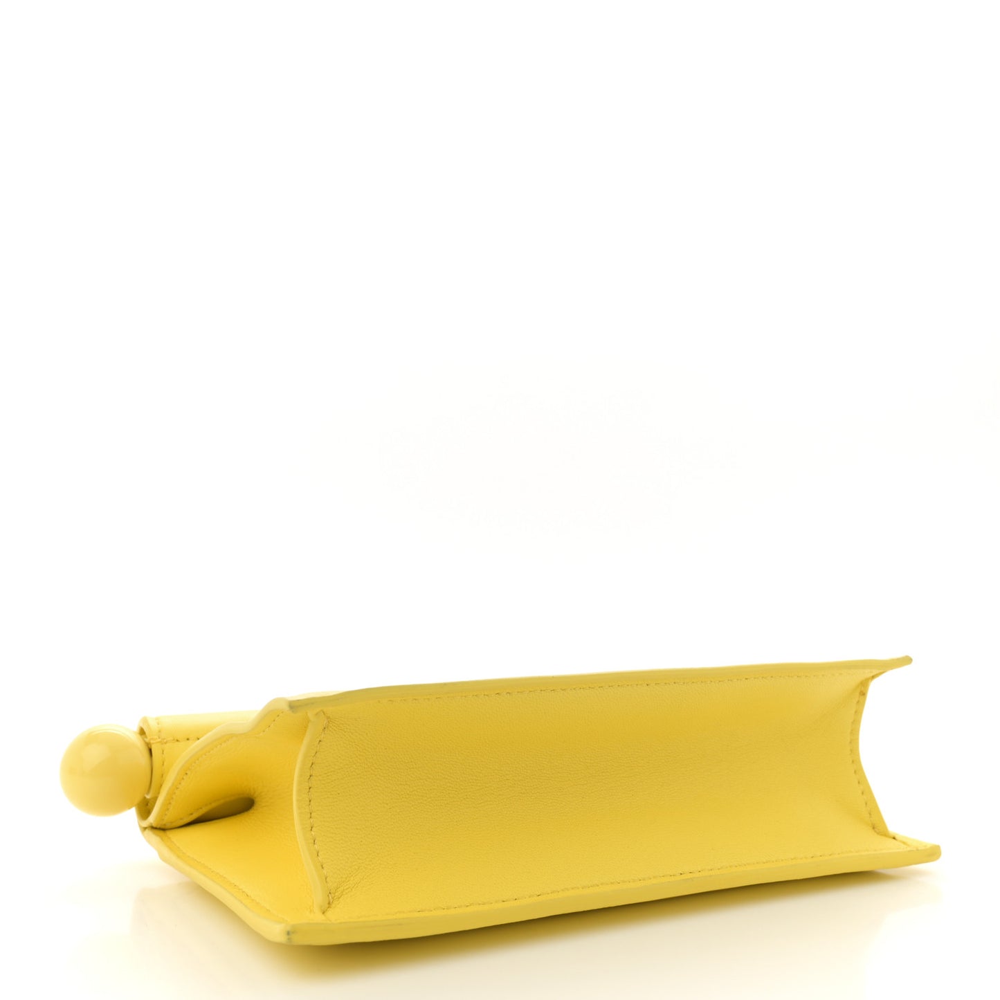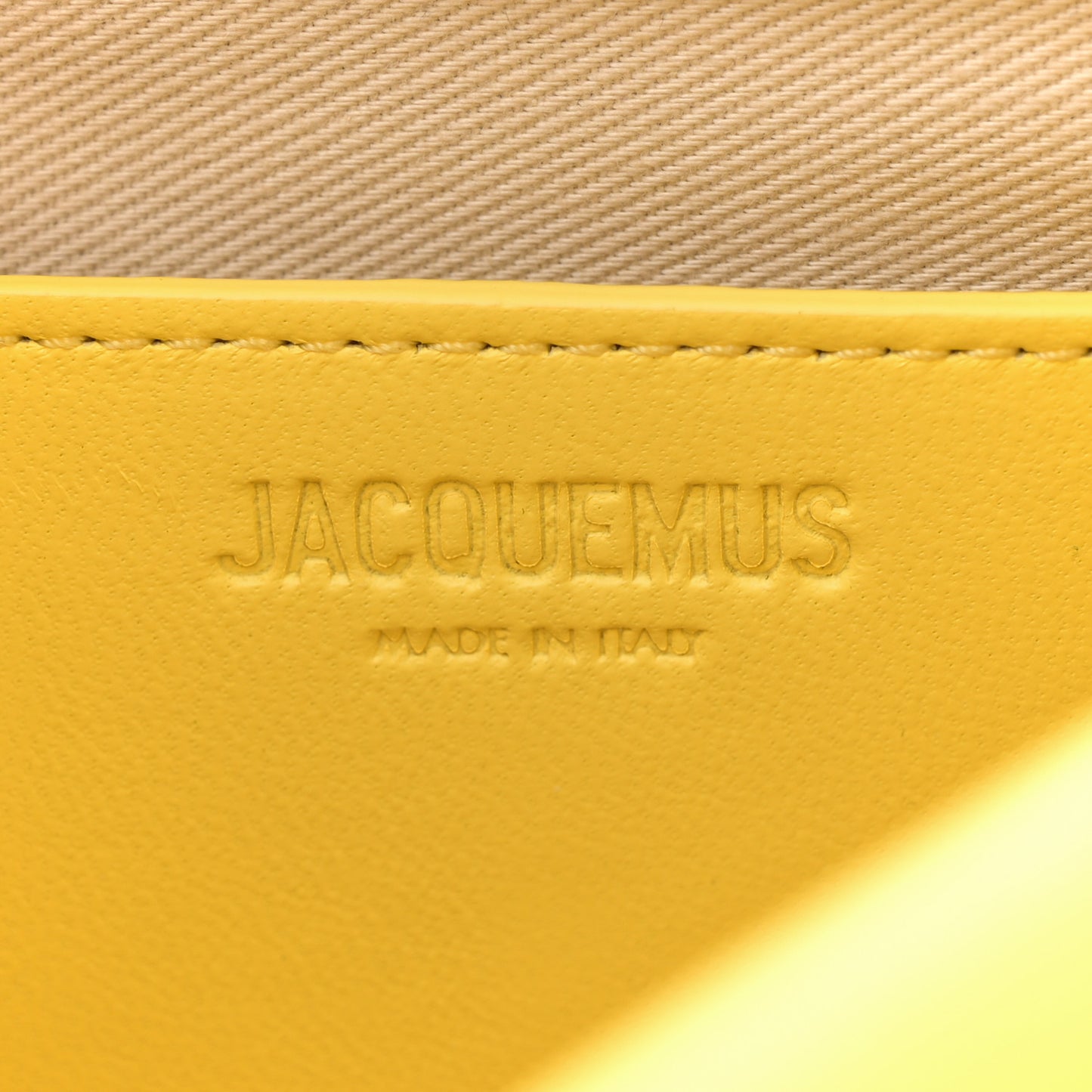 This is an authentic JACQUEMUS Smooth Calfskin La Petite Pochette Rond Carre in Yellow. This stylish bag is crafted of smooth calfskin leather in bright yellow. The bag features gold hardware including a chain strap with a fold over closure. The top unfolds to a beige fabric interior with a pocket.Follow this item for alerts. Jacquemus is a registered trademark of Jacquemus. FASHIONPHILE is not affiliated with Jacquemus.