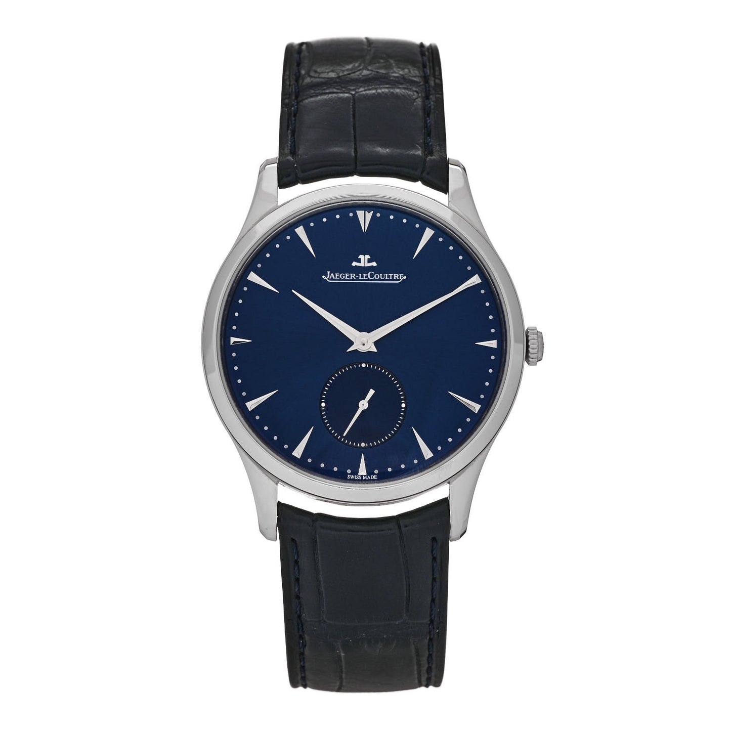 This is an authentic Jaeger-LeCoultre Stainless Steel Alligator 40mm Master Grande Ultra Thin Automatic Watch Blue Q1358480. This watch is crafted of stainless steel and features a blue dial with silver hour markers, sub dial, sapphire crystal, stainless steel bracelet, and an automatic movement.Follow this item for alerts. Jaeger-LeCoultre is a registered trademark of Jaeger-LeCoultre. FASHIONPHILE is not affiliated with Jaeger-LeCoultre.