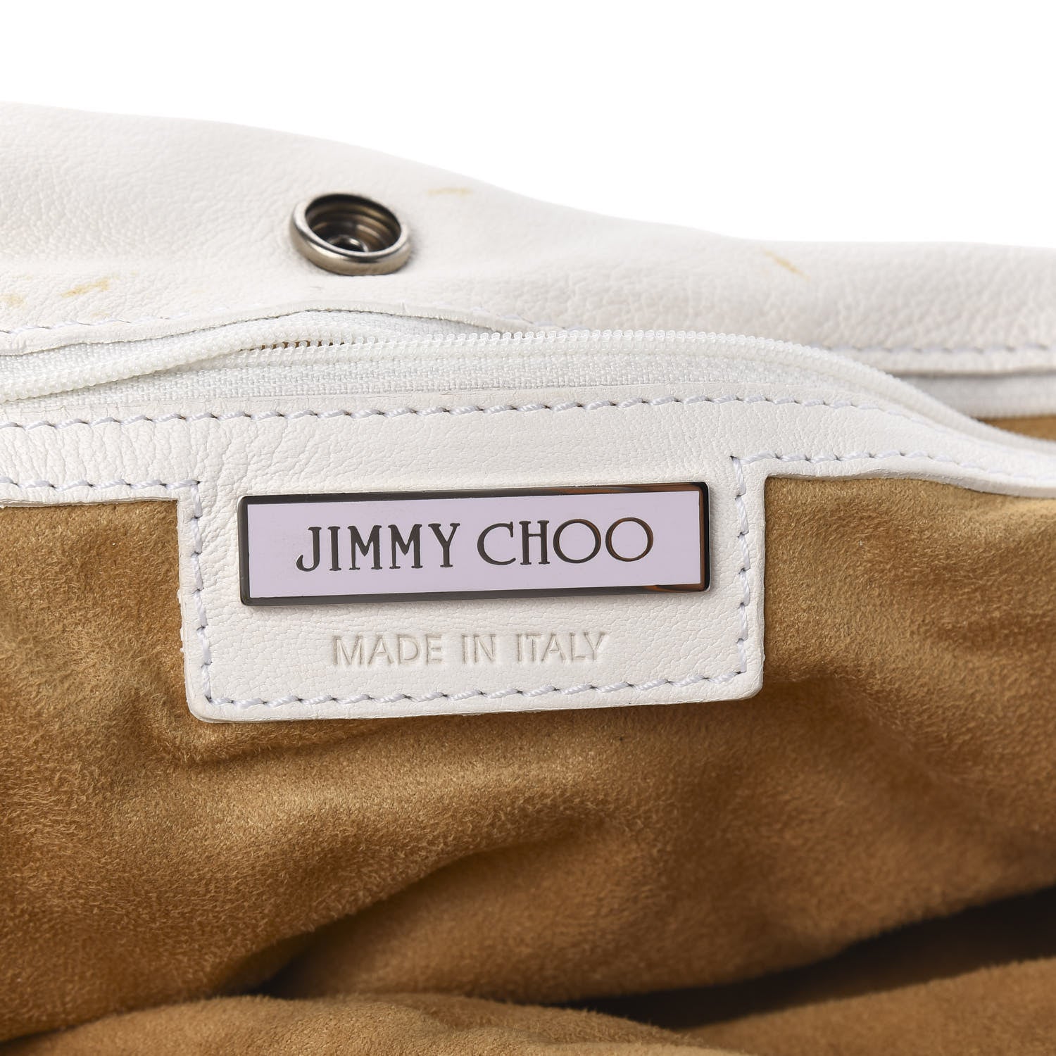 This is an authentic JIMMY CHOO Calfskin Studded Lola Tote in White. The refined quality and exceptional features of this Jimmy Choo tote lend a look of chic sophistication for everyday. The tote is large size and is crafted of soft, relaxed white calfskin leather. It has sturdy leather shoulder straps and intricate leather work. The tote features a studded detailed patterns throughout the leather tailoring on all sides for a bold look. The top is open to an interior that is a camel colored fabric with a zipper and patch pockets. This is an excellent bag that is stylish and fabulously functional as an ideal everyday bag for all of your everyday needs that call for the special touch of chic, one of a kind style from Jimmy Choo.Follow this item for alerts. Jimmy Choo is a registered trademark of Jimmy Choo. FASHIONPHILE is not affiliated with Jimmy Choo.