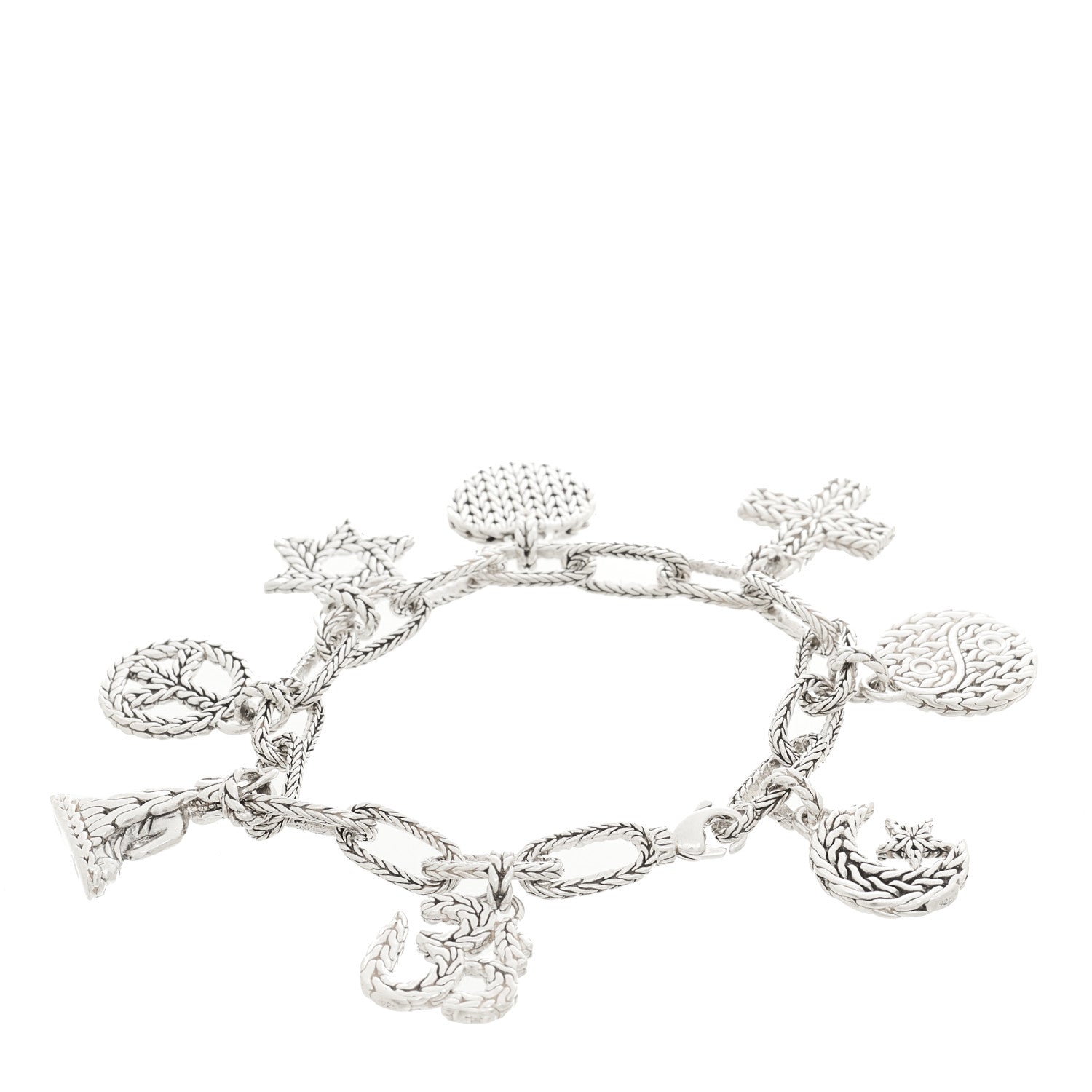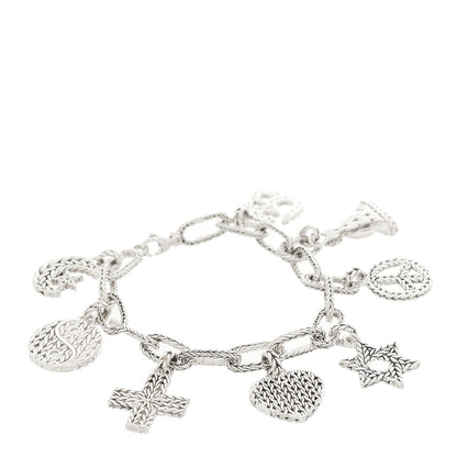 This is an authentic JOHN HARDY Sterling Silver 8 Charm Bracelet. The charm bracelet is crafted of sterling silver and features an oval link chain holding various charms, in the signature, carved twisted chain design.Follow this item for alerts. John Hardy is a registered trademark of John Hardy. FASHIONPHILE is not affiliated with John Hardy.