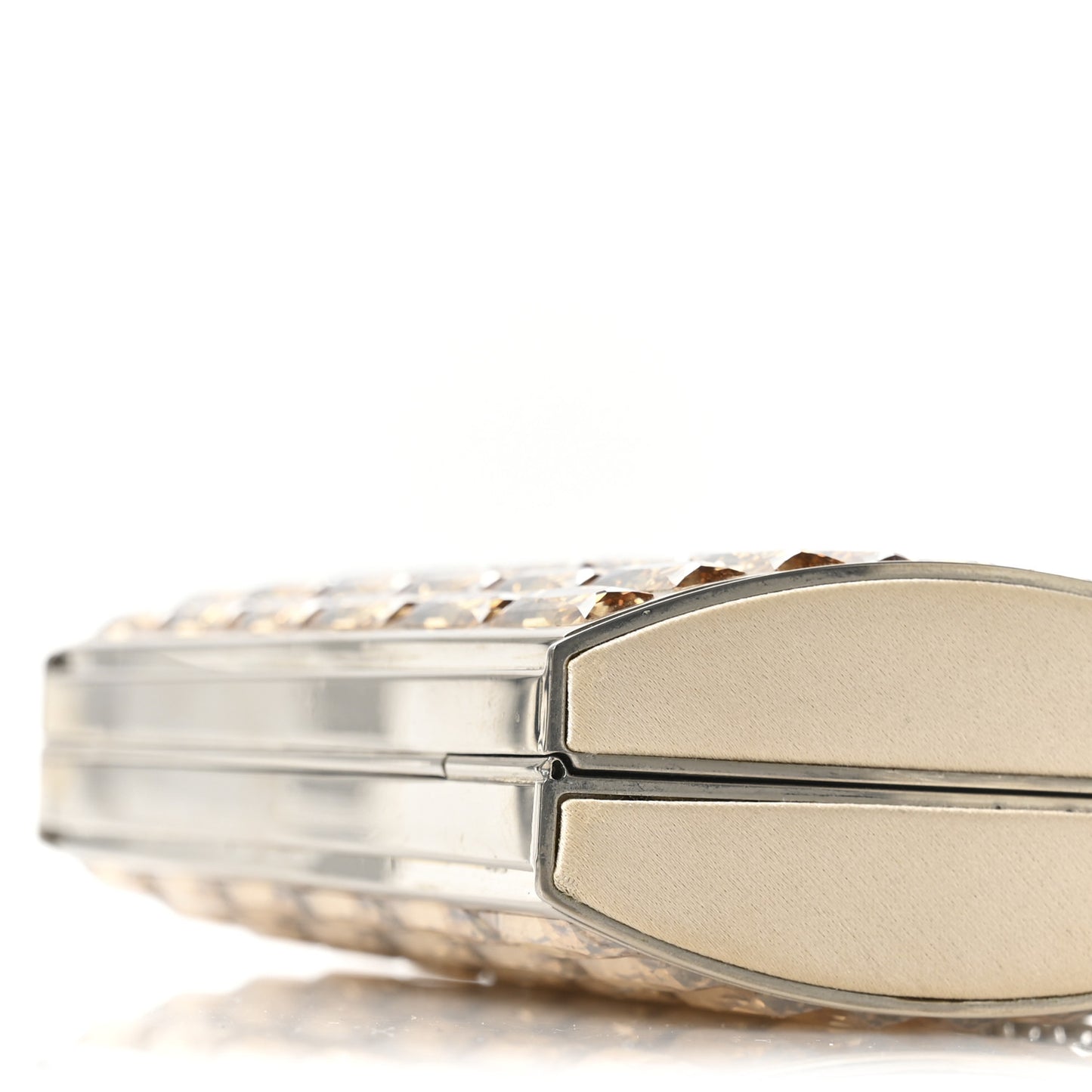This is an authentic JUDITH LEIBER Swarovski Crystal Goddess Clutch in Champagne. This light gold structured clutch features matching crystals and silk side panels. The press lock opens to a silver leather interior with a short chain strap.Follow this item for alerts. Judith Leiber is a registered trademark of Judith Leiber. FASHIONPHILE is not affiliated with Judith Leiber.