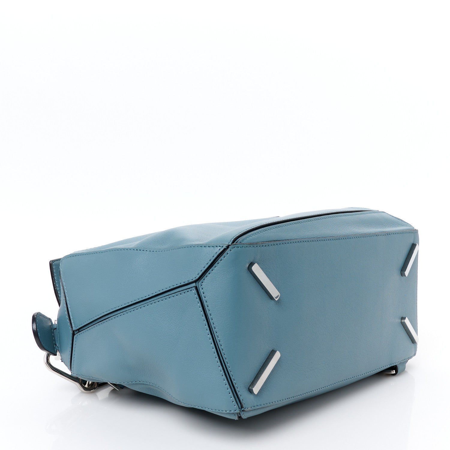 This is an authentic LOEWE Calfskin Medium Puzzle Bag in Stone Blue. This bag is crafted of luxurious calfskin leather in blue. The bag features a rolled leather handle, an adjustable shoulder strap with silver hardware, and a rear zipper pocket. The top zipper is hidden under a crossover flap with an embossed Loewe logo, and opens to a herringbone-patterned cotton canvas lining with pockets.Follow this item for alerts. Loewe is a registered trademark of Loewe. FASHIONPHILE is not affiliated with Loewe.