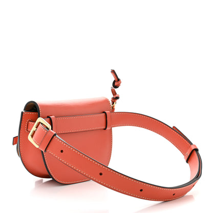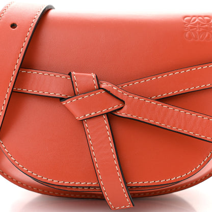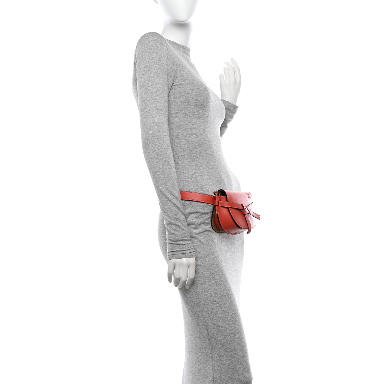 This is an authentic LOEWE Calfskin Mini Gate Belt Bag in Orange. This chic belt bag is crafted of smooth calfskin leather in orange. The bag features a knotted detail that holds the front flap and an adjustable belt with gold hardware. The flap opens up to a brown suede interior with a small patch pocket.Follow this item for alerts. Loewe is a registered trademark of Loewe. FASHIONPHILE is not affiliated with Loewe.