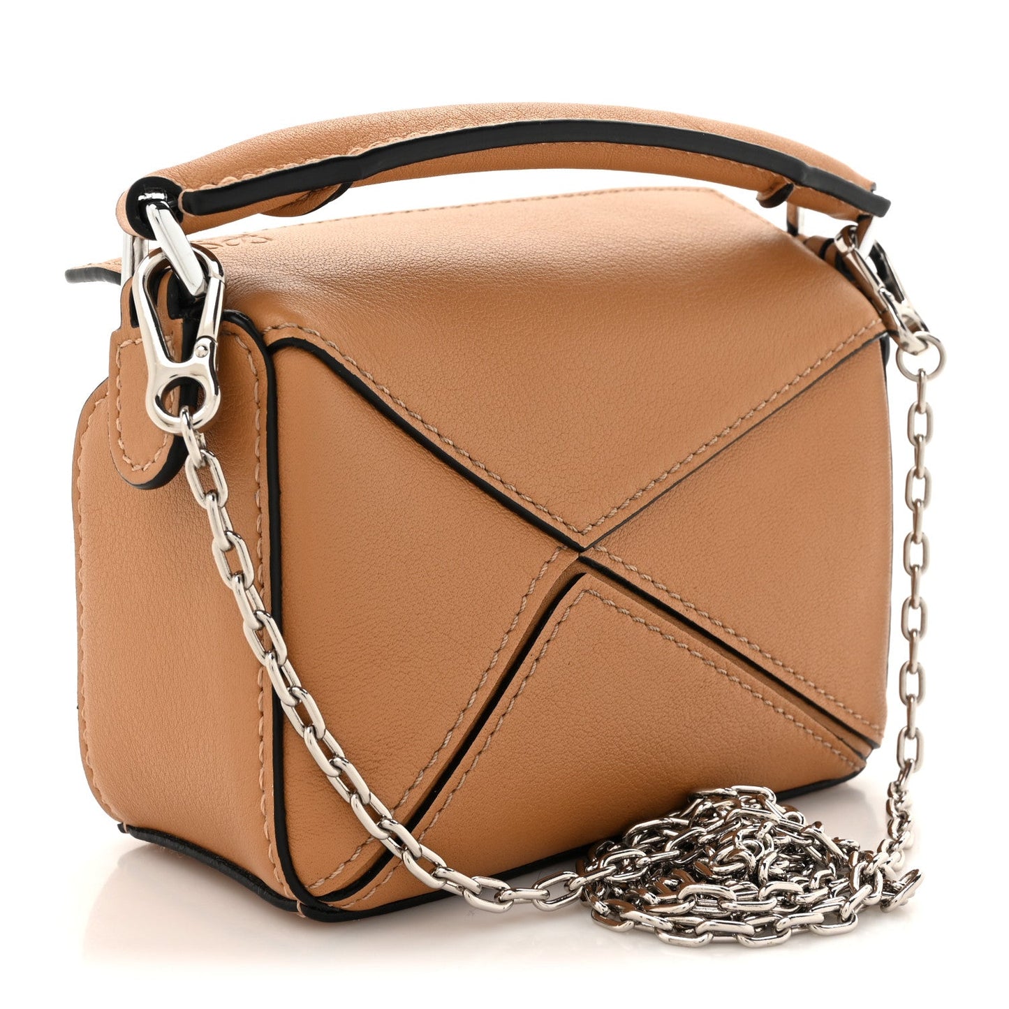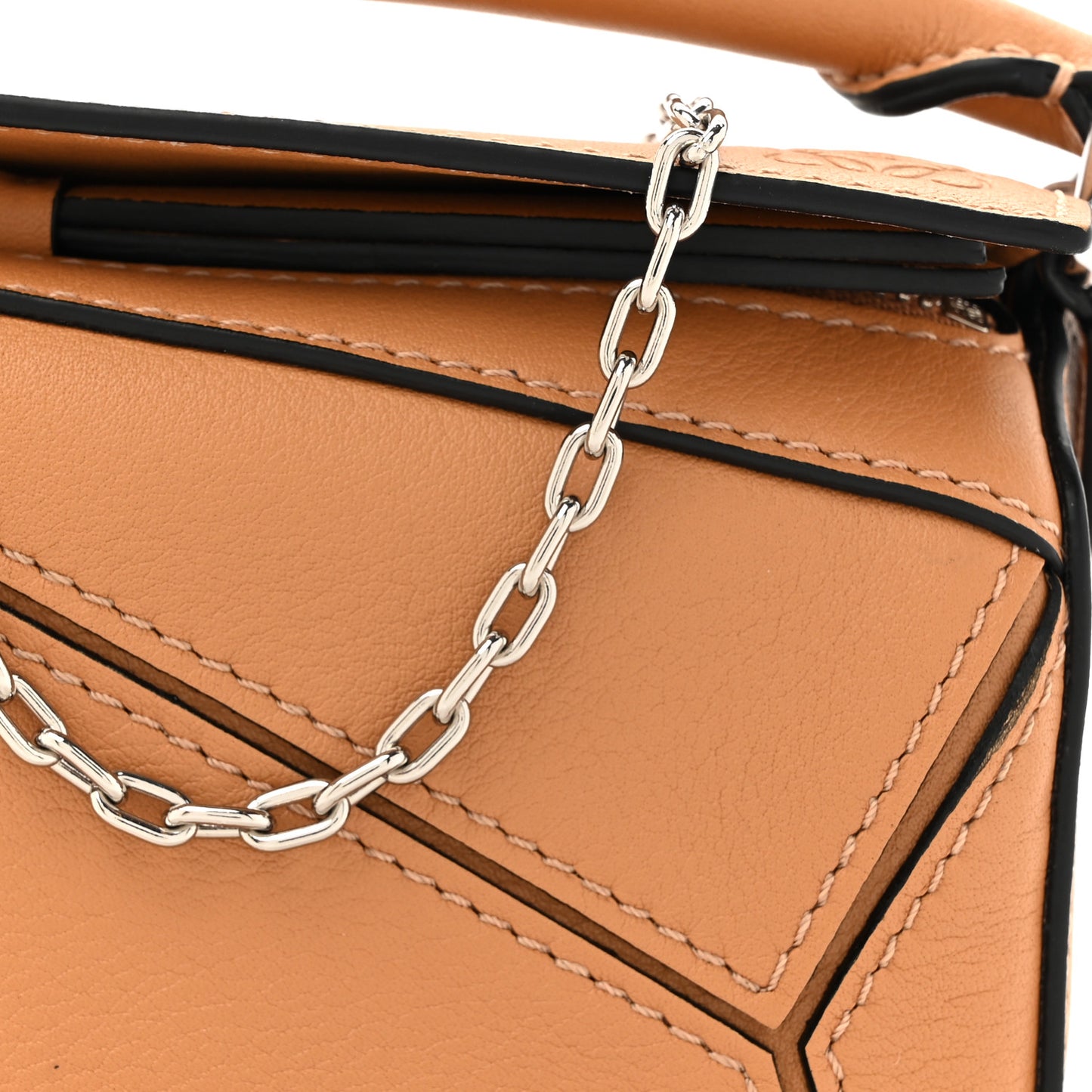 This is an authentic LOEWE Calfskin Nano Puzzle Bag in Warm Desert. This stunning bag is crafted of smooth calfskin leather in light brown. The bag features a rolled leather handle and a silver chain-link shoulder strap. The top zipper opens to a beige fabric interior.Follow this item for alerts. Loewe is a registered trademark of Loewe. FASHIONPHILE is not affiliated with Loewe.