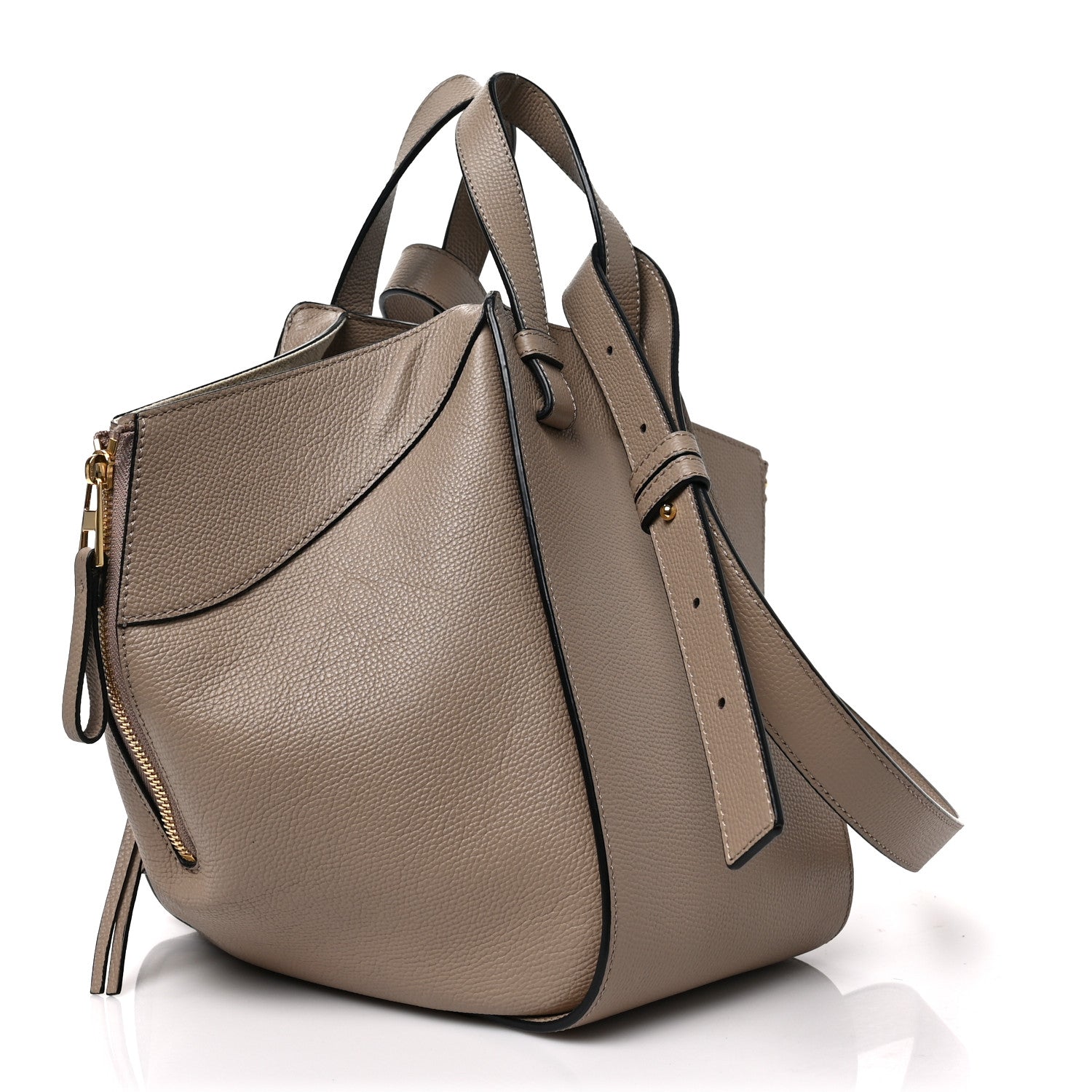 This is an authentic LOEWE Calfskin Small Hammock Shoulder Bag in Sand. This chic and lovely tote is crafted of luxuriously soft calfskin leather in beige. This handbag features a unique one-piece reinforced design with leather top handles, a top cinch cord, and an optional adjustable shoulder strap. The top opens to a spacious natural fabric interior with small patch pockets.