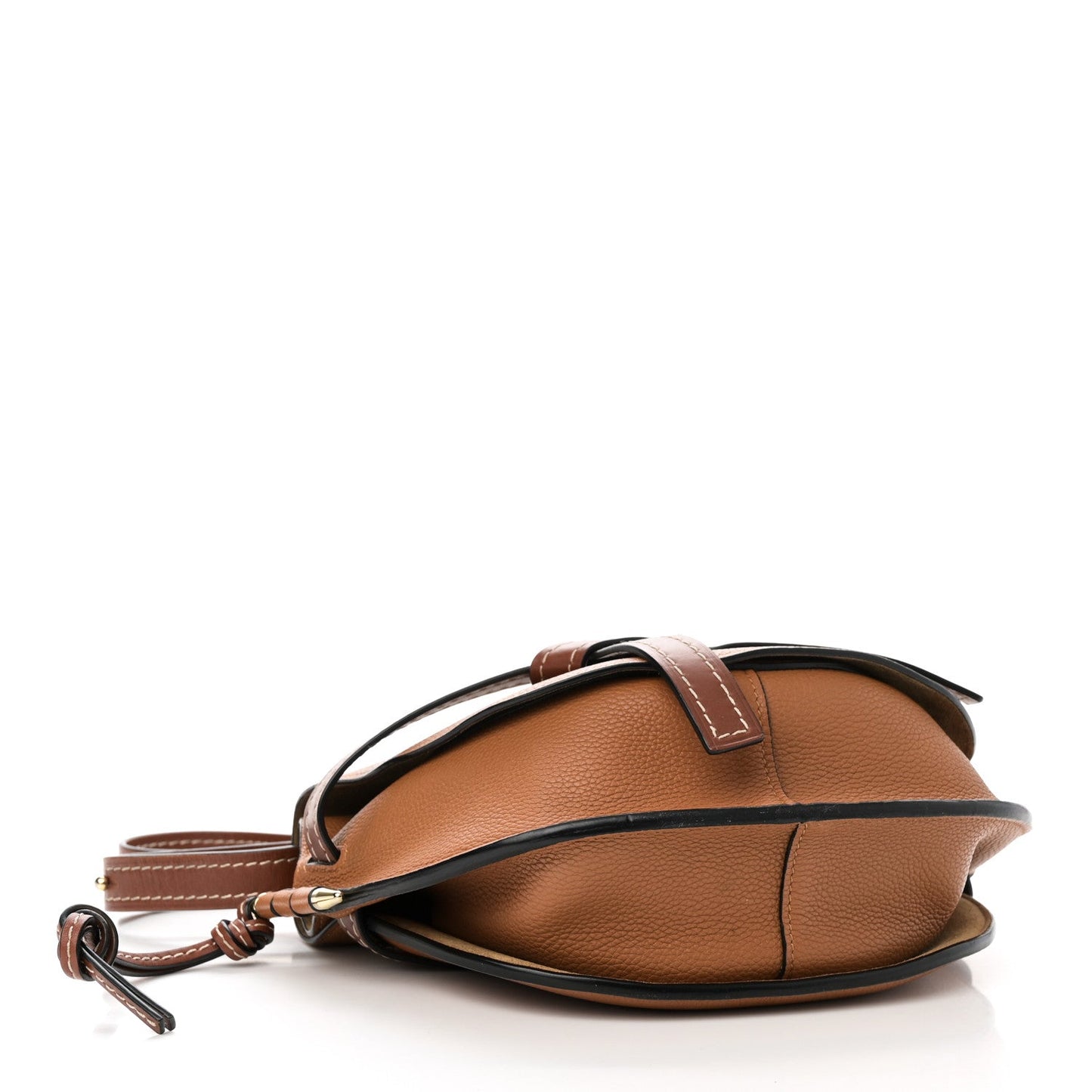 This is an authentic LOEWE Grained Calfskin Small Gate Crossbody Bag in Caramel and Pecan. This chic crossbody is crafted of grained calfskin leather in light brown. The bag features a shoulder strap, a front knotted detail that holds the front flap, and gold hardware. The flap opens up to a brown suede interior with a small patch pocket.Follow this item for alerts. Loewe is a registered trademark of Loewe. FASHIONPHILE is not affiliated with Loewe.