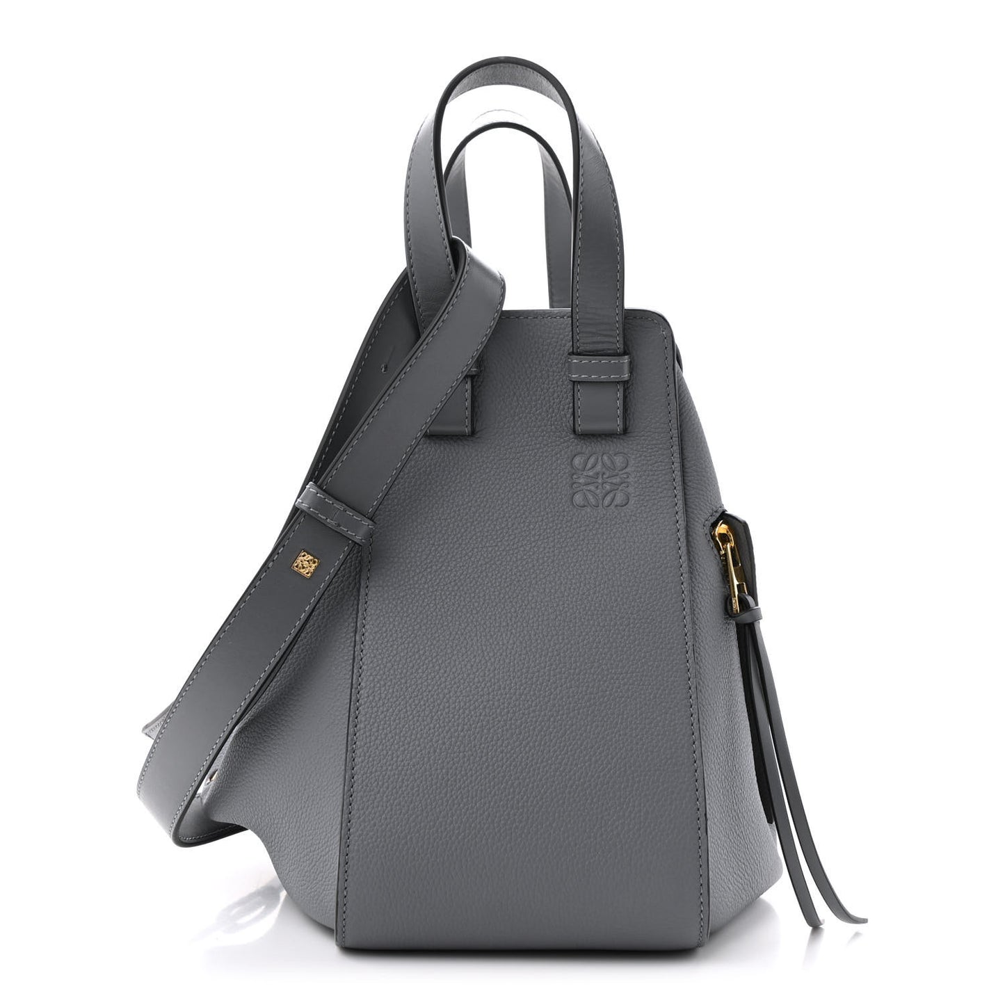 This is an authentic LOEWE Grained Calfskin Small Hammock Shoulder Bag in Asphalt. This chic and lovely tote is crafted of luxuriously grained calfskin leather in gray. This handbag features a unique one piece reinforced design with leather top handles, gold hardware, and an optional adjustable shoulder strap. The top opens to a spacious natural fabric interior with small patch pockets.Follow this item for alerts. Loewe is a registered trademark of Loewe. FASHIONPHILE is not affiliated with Loewe.