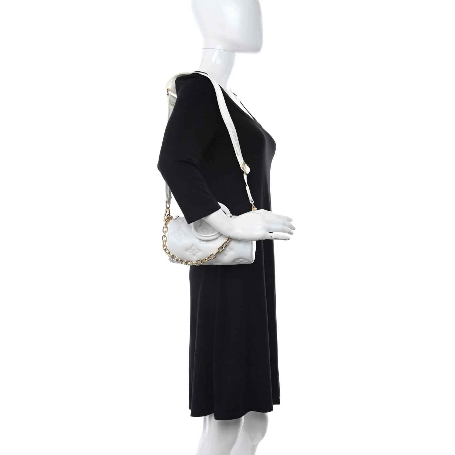 This is the authentic LOUIS VUITTON Calfskin Bubblegram Papillon BB in Snow White. This limited edition barrel-shaped bag is created of puffy calfskin leather and embroidered Louis Vuitton monogram in white. It features rolled leather top handles, an optional adjustable nylon shoulder strap and a gold chain strap. The top zipper opens to a white fabric interior.Follow this item for alerts. Louis Vuitton is a registered trademark of Louis Vuitton. FASHIONPHILE is not affiliated with Louis Vuitton.
