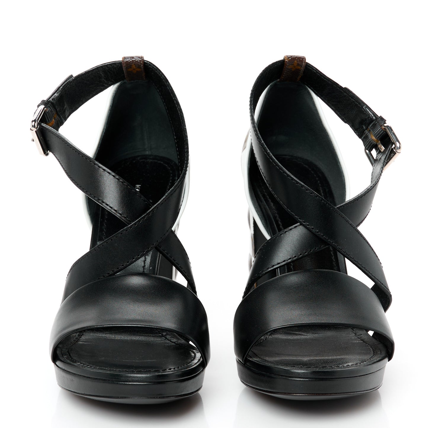 This is an authentic pair of LOUIS VUITTON Calfskin Monogram Damier Tressage Matchmake Cross Sandals in size 38. These stunning sandals are crafted of monogram coated canvas and smooth leather. They feature black leather trim, polished silver hardware, and 4.5-inch heels.Follow this item for alerts. Louis Vuitton is a registered trademark of Louis Vuitton. FASHIONPHILE is not affiliated with Louis Vuitton.