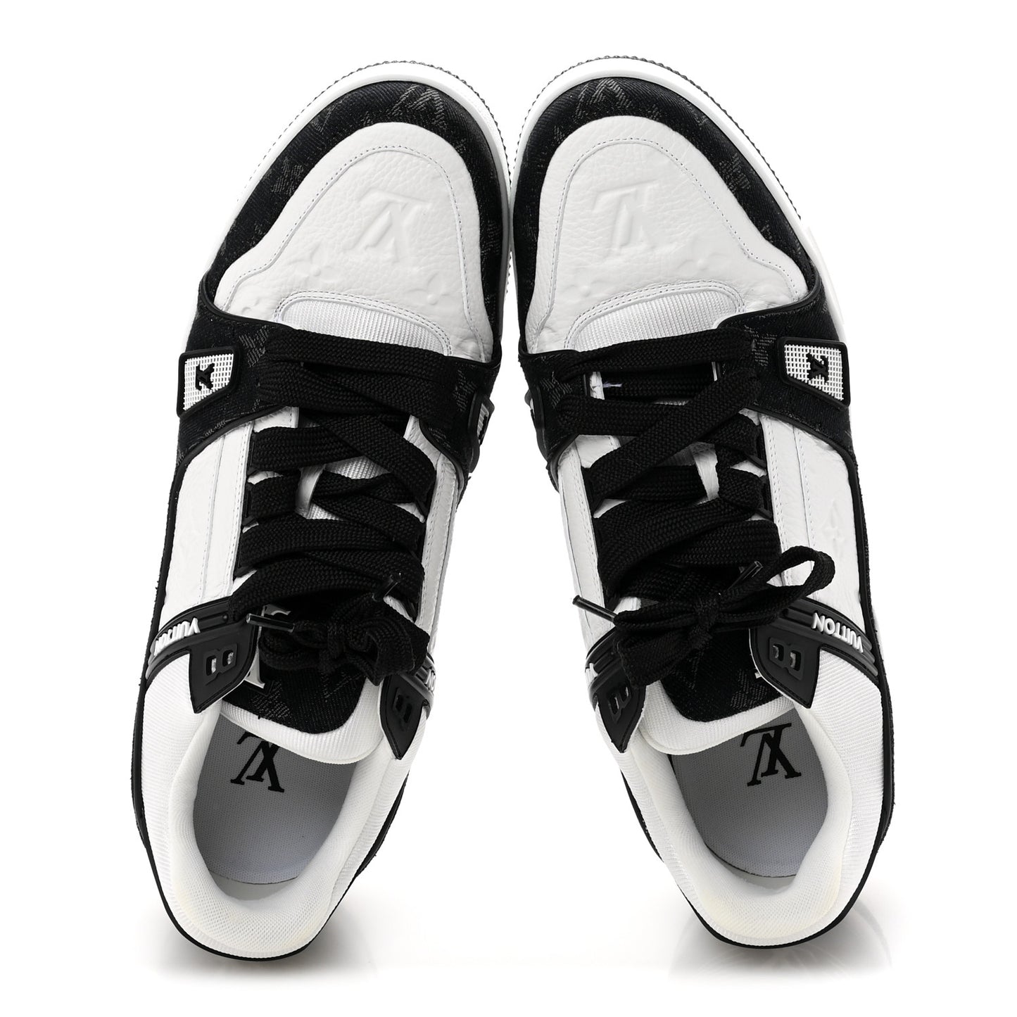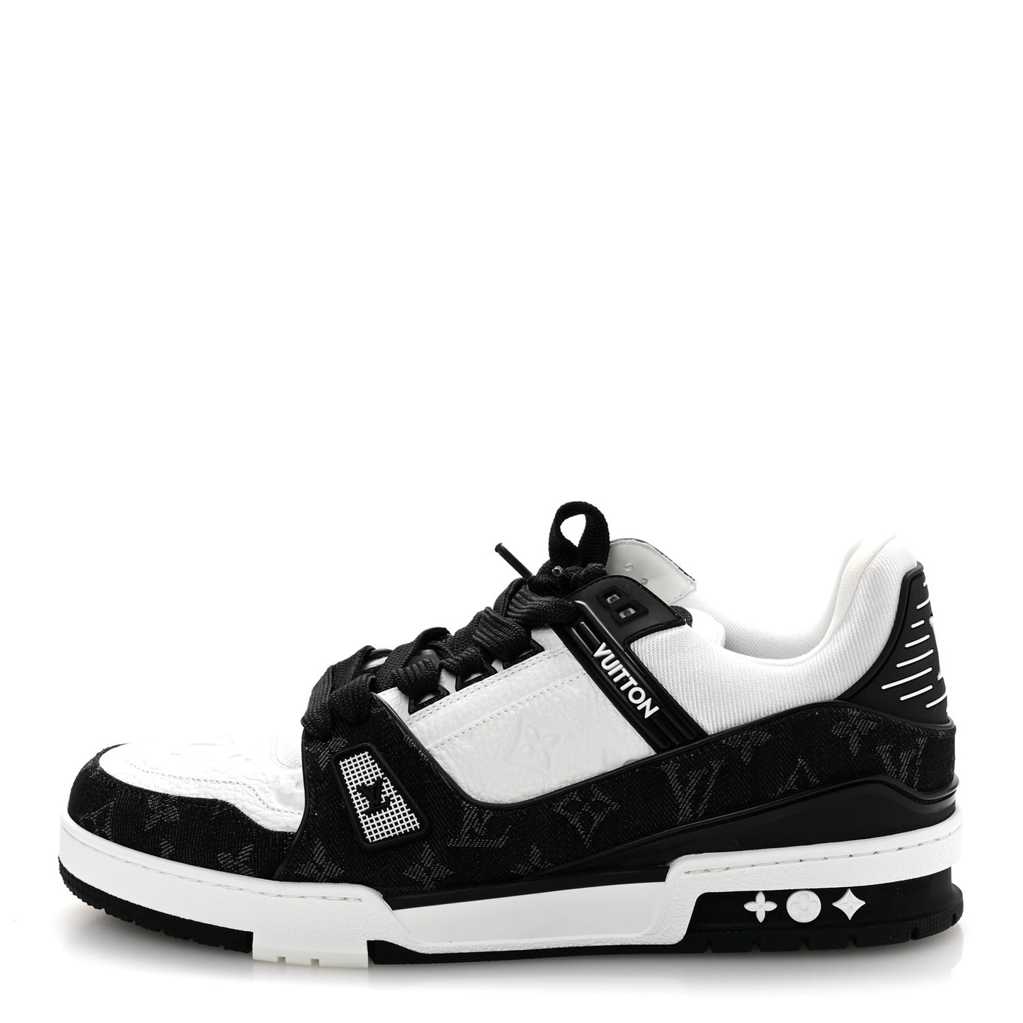 This is an authentic pair of LOUIS VUITTON Calfskin Monogram Denim Mens LV Trainer Sneakers size 9 in Black. These sneakers are crafted of white calfskin and black monogrammed denim. The contrasting colors and materials highlight this model's elaborate construction, inspired by vintage basketball sneakers. A single pair takes seven hours to stitch.Follow this item for alerts. Louis Vuitton is a registered trademark of Louis Vuitton. FASHIONPHILE is not affiliated with Louis Vuitton.