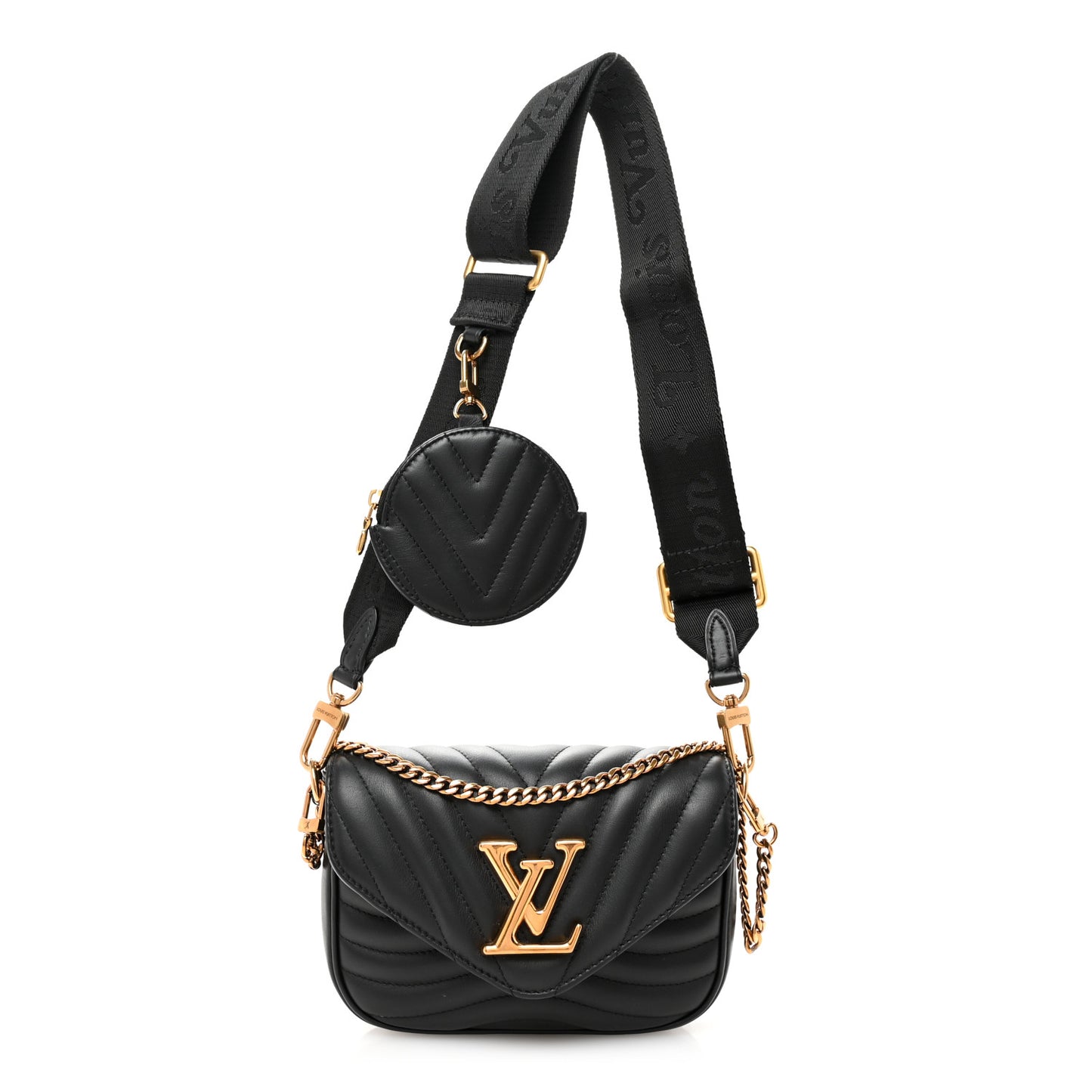 This is an authentic LOUIS VUITTON Calfskin New Wave Multi Pochette in Black. This chic shoulder bag is crafted of quilted calfskin leather in black. The shoulder bag features a gold chain strap, an adjustable shoulder strap, a removable coin purse, and aged gold hardware. The top flap opens to a black microfiber interior with a patch pocket.Follow this item for alerts. Louis Vuitton is a registered trademark of Louis Vuitton. FASHIONPHILE is not affiliated with Louis Vuitton.