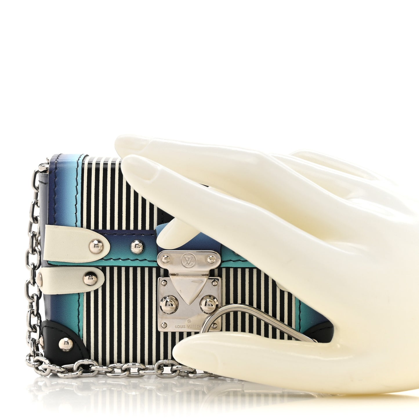 This is an authentic LOUIS VUITTON Calfskin Printed Essential Trunk in Blue. This stylish wristlet is crafted of calfskin leather in blue multicolor. The wristlet features a silver chain wrist strap, black and white leather trim, silver studded lining at the joints, and a silver press lock. This opens to a beige Malletage printed leather interior.Follow this item for alerts. Louis Vuitton is a registered trademark of Louis Vuitton. FASHIONPHILE is not affiliated with Louis Vuitton.
