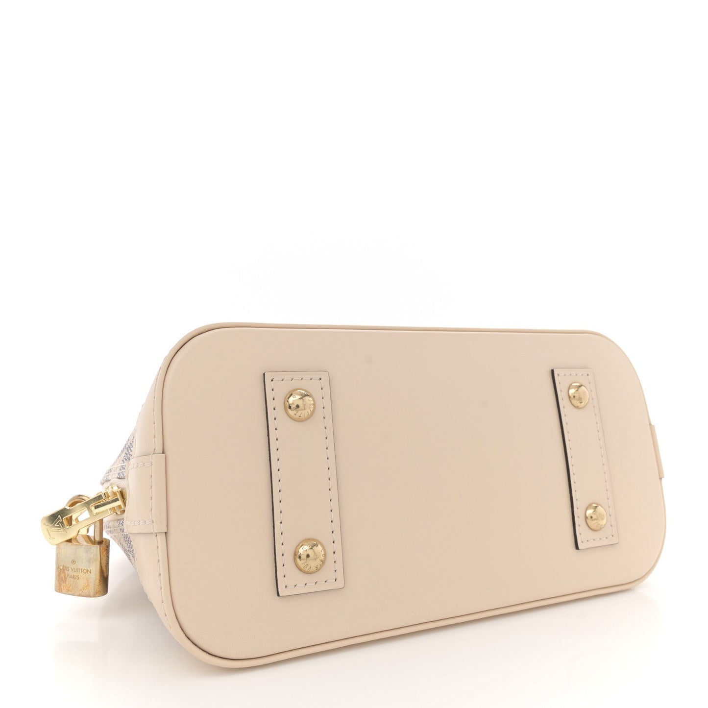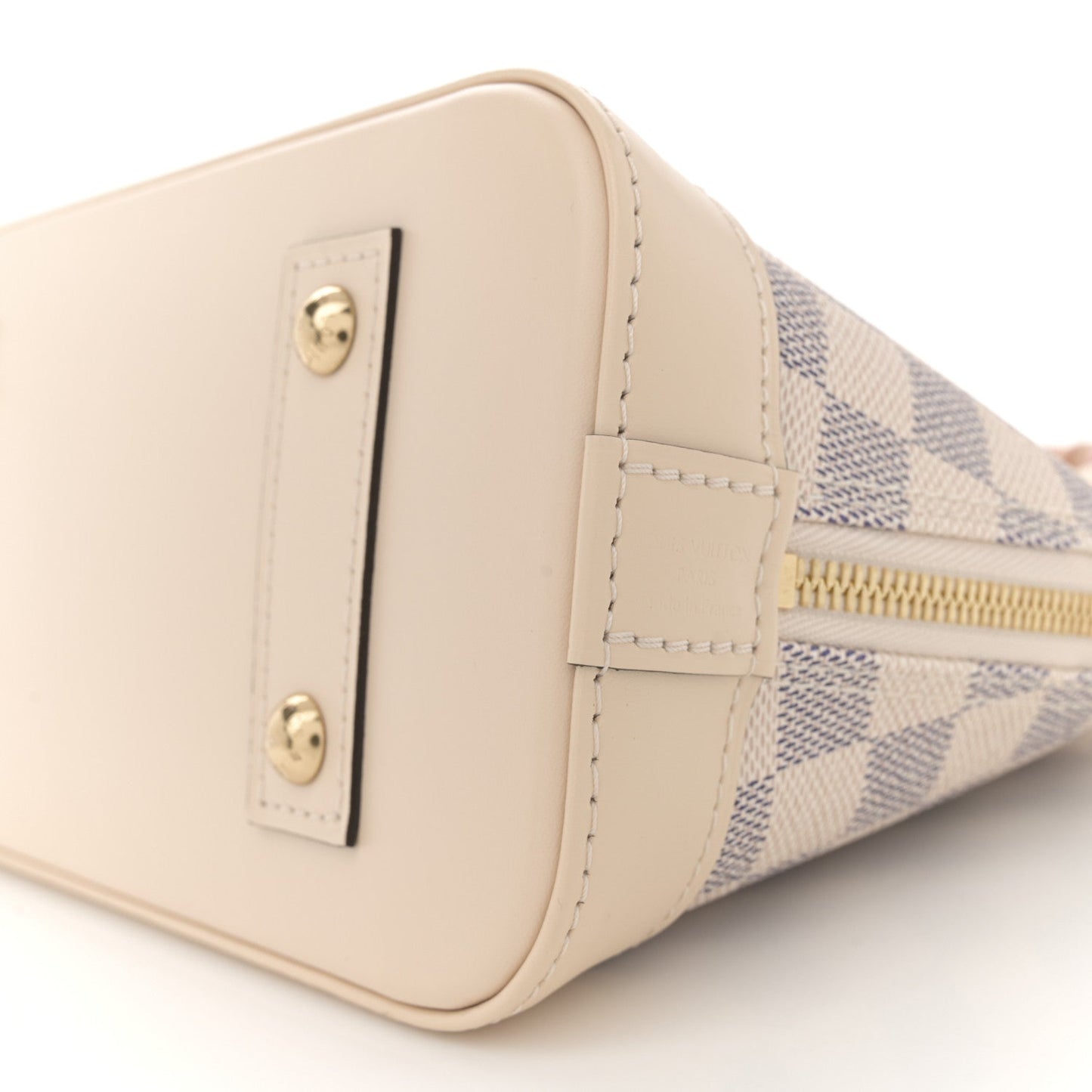 This is an authentic LOUIS VUITTON Damier Azur Braided Alma BB. This mini bowling-style handbag is crafted of Louis Vuitton's signature Damier coated canvas in white and blue. The bag features beautiful white cowhide leather trim including a solid base, pink and brown woven leather top handles, and an optional shoulder strap with brass hardware. The wrap-around zippers open to a pink fabric interior with a patch pocket.Follow this item for alerts. Louis Vuitton is a registered trademark of Louis Vuitton. FASHIONPHILE is not affiliated with Louis Vuitton.