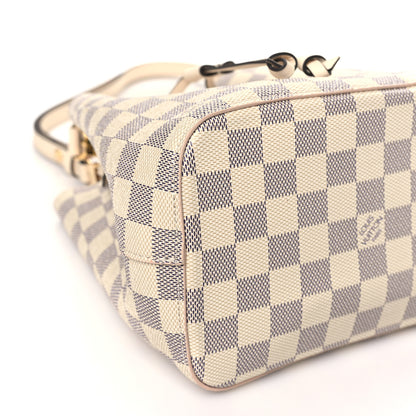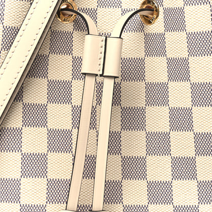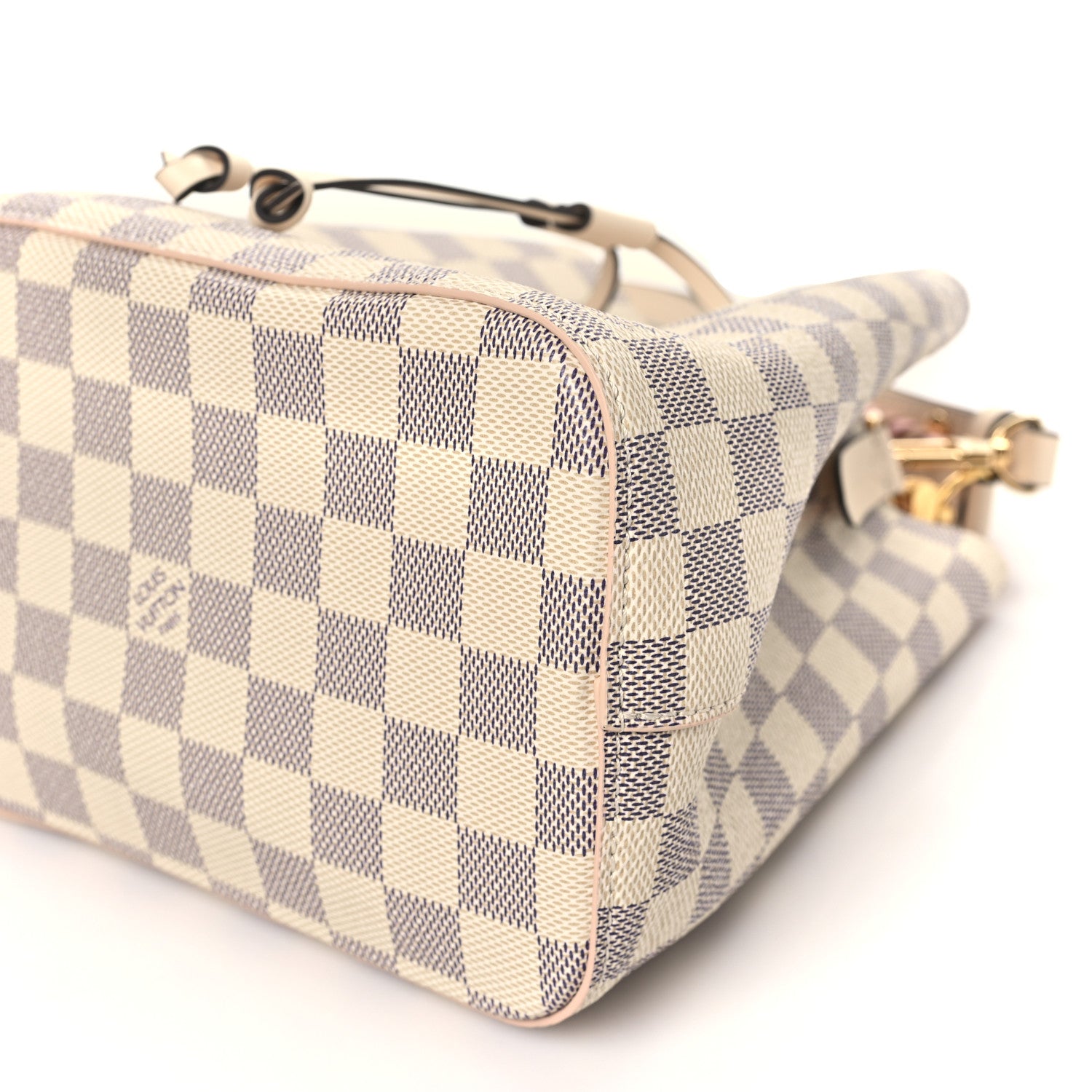 This is an authentic LOUIS VUITTON Damier Azur Braided Neonoe BB in Pink. This classic bucket style shoulder bag is crafted of Louis Vuitton damier coated canvas in cream and blue. The bag features a peach and cream top handle with woven details, leather shoulder strap, and top cinch cord with polished gold plated hardware. The top is open to a partitioned pink microfiber interior with a middle snap button pocket.Follow this item for alerts. Louis Vuitton is a registered trademark of Louis Vuitton. FASHIONPHILE is not affiliated with Louis Vuitton.
