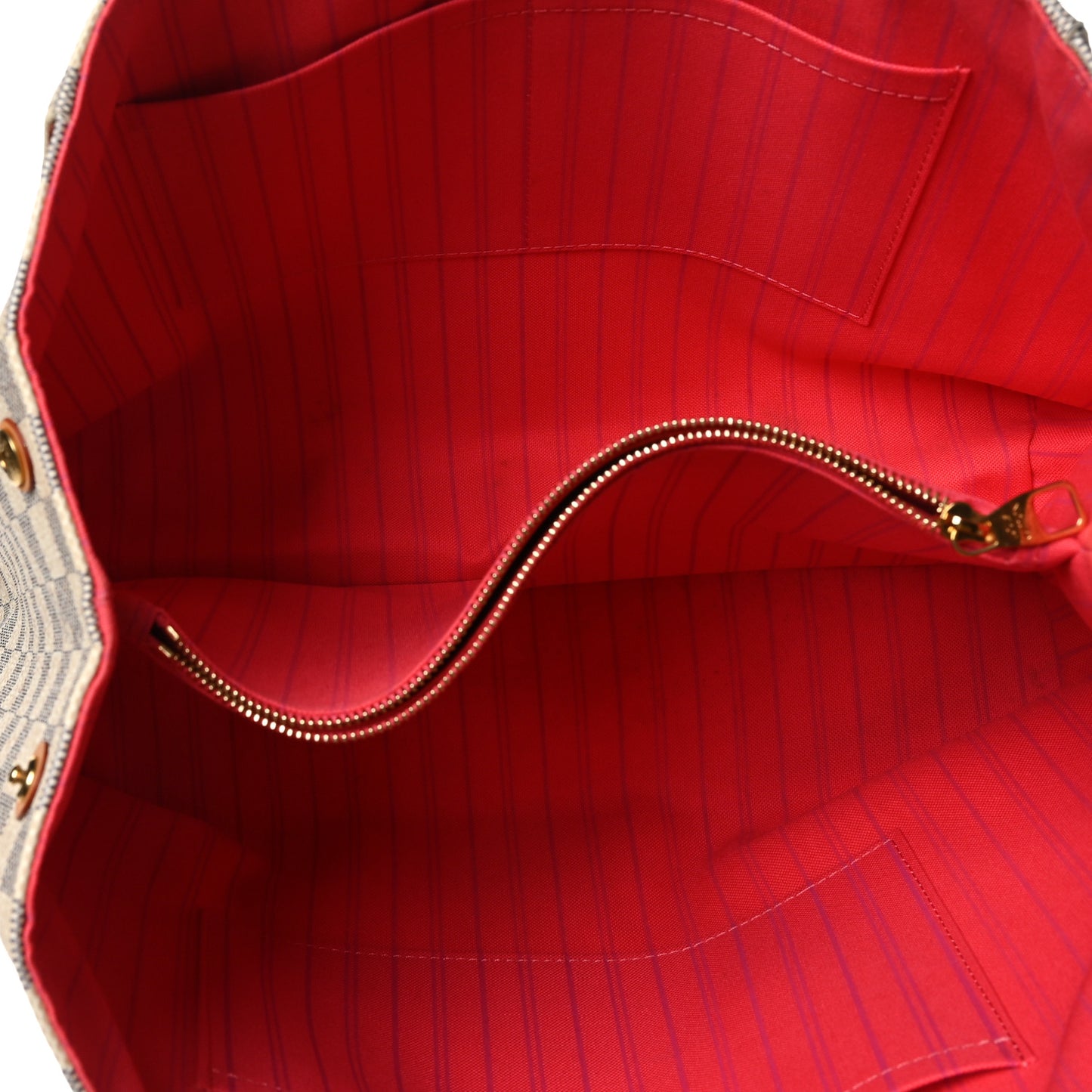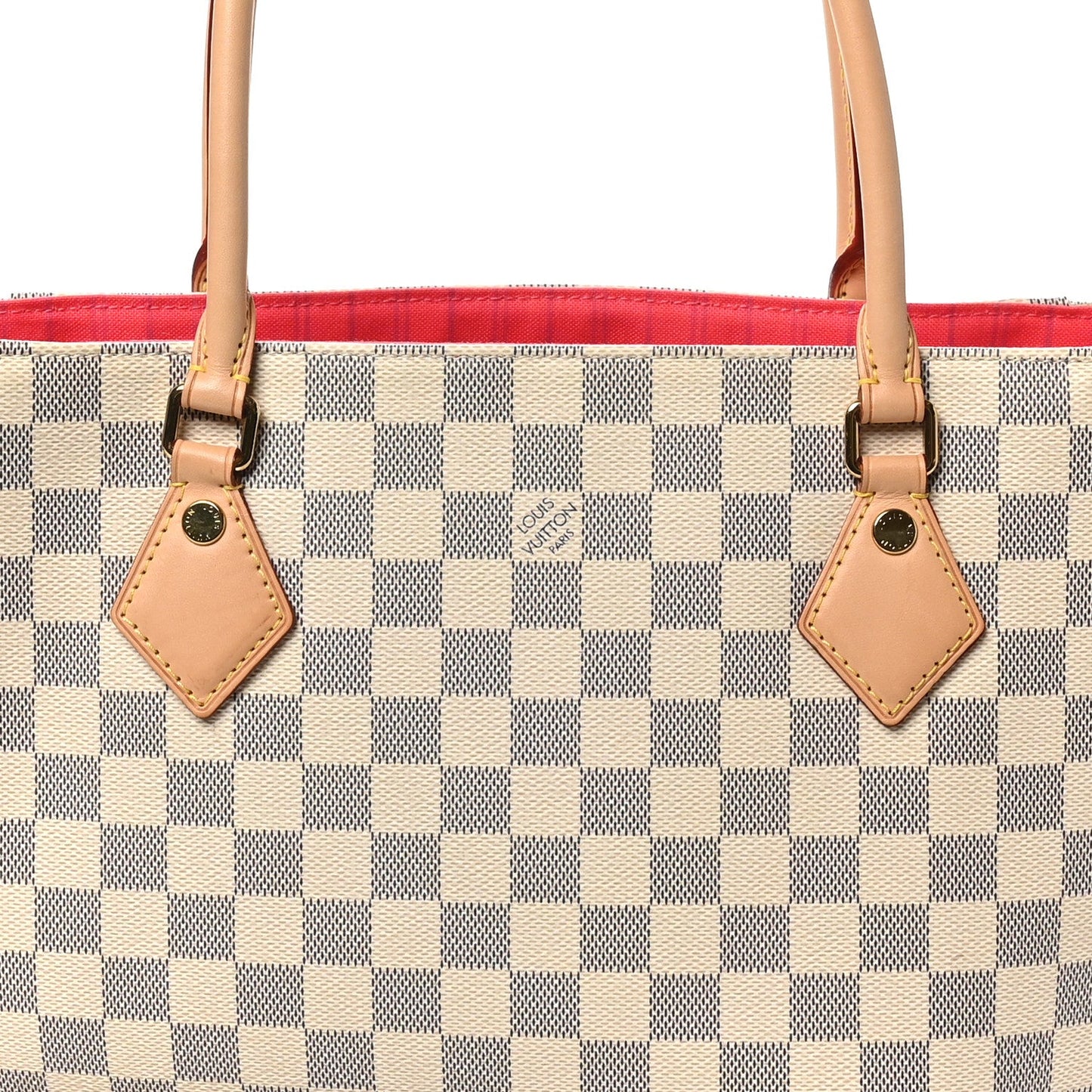 This is an authentic LOUIS VUITTON Damier Azur Calvi. This handbag is crafted of Louis Vuitton damier blue and white checkered canvas. This shoulder bag features button snap expandable sides, vachetta cowhide leather trim, and rolled vachetta leather top handles with polished brass hardware. The bag has a broad top opening to a partitioned bright pink striped fabric interior with pockets.Follow this item for alerts. Louis Vuitton is a registered trademark of Louis Vuitton. FASHIONPHILE is not affiliated with Louis Vuitton.