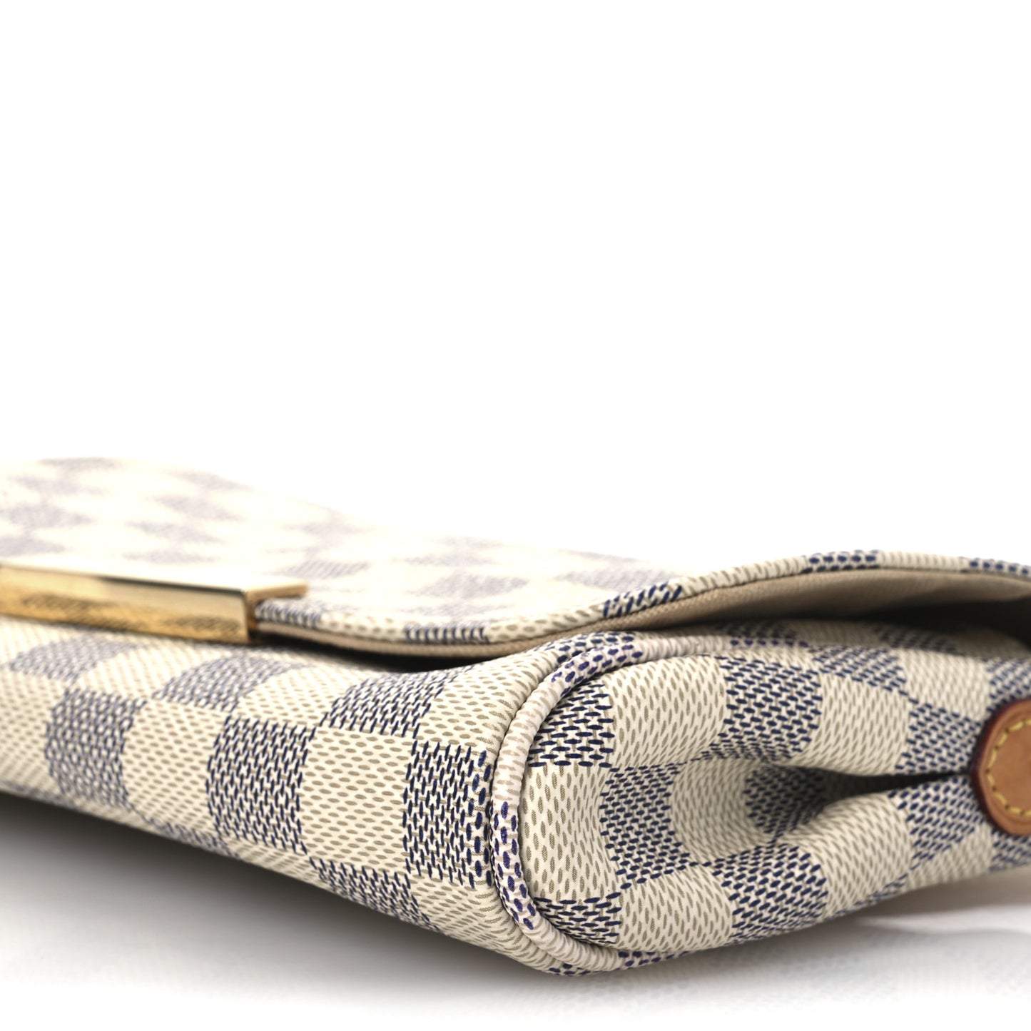 This is an authentic LOUIS VUITTON Damier Azur Favorite PM. This stylish shoulder bag is crafted of Louis Vuitton Damier checked coated canvas in blue and white. This bag can be worn with the removable vachetta cowhide leather shoulder strap or with the polished brass chain wrist strap. The wrist strap has a clip on one end that can be attached to the D-ring of a larger bag. This bag also features matching Damier piping and a flap trimmed with a Louis Vuitton logo plate in brass. The flap opens to a beige canvas fabric lining with a patch pocket.Follow this item for alerts. Louis Vuitton is a registered trademark of Louis Vuitton. FASHIONPHILE is not affiliated with Louis Vuitton.