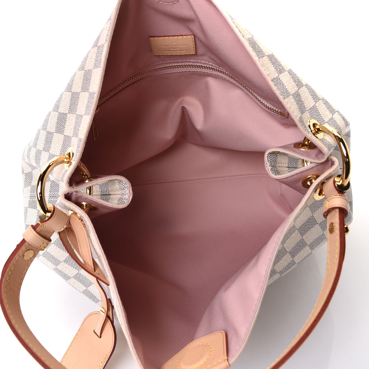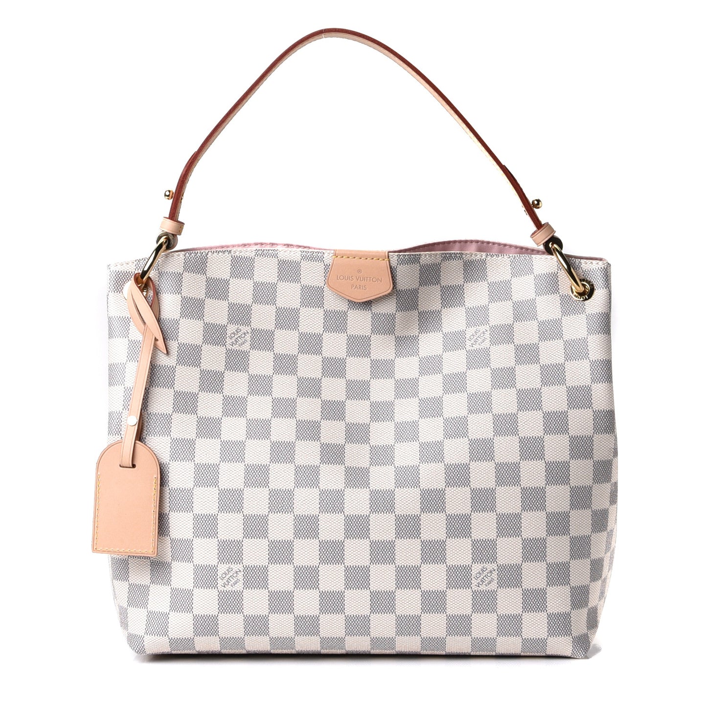 This is an authentic LOUIS VUITTON Damier Azur Graceful PM in Rose Ballerine. This stylish shoulder bag is finely crafted of Louis Vuitton's signature Damier coated canvas in blue and white. The bag features a flat vachetta leather shoulder strap with polished brass hardware and a magnetic closure. This opens the bag to a spacious light pink fabric interior with a zipper pocket.Follow this item for alerts. Louis Vuitton is a registered trademark of Louis Vuitton. FASHIONPHILE is not affiliated with Louis Vuitton.