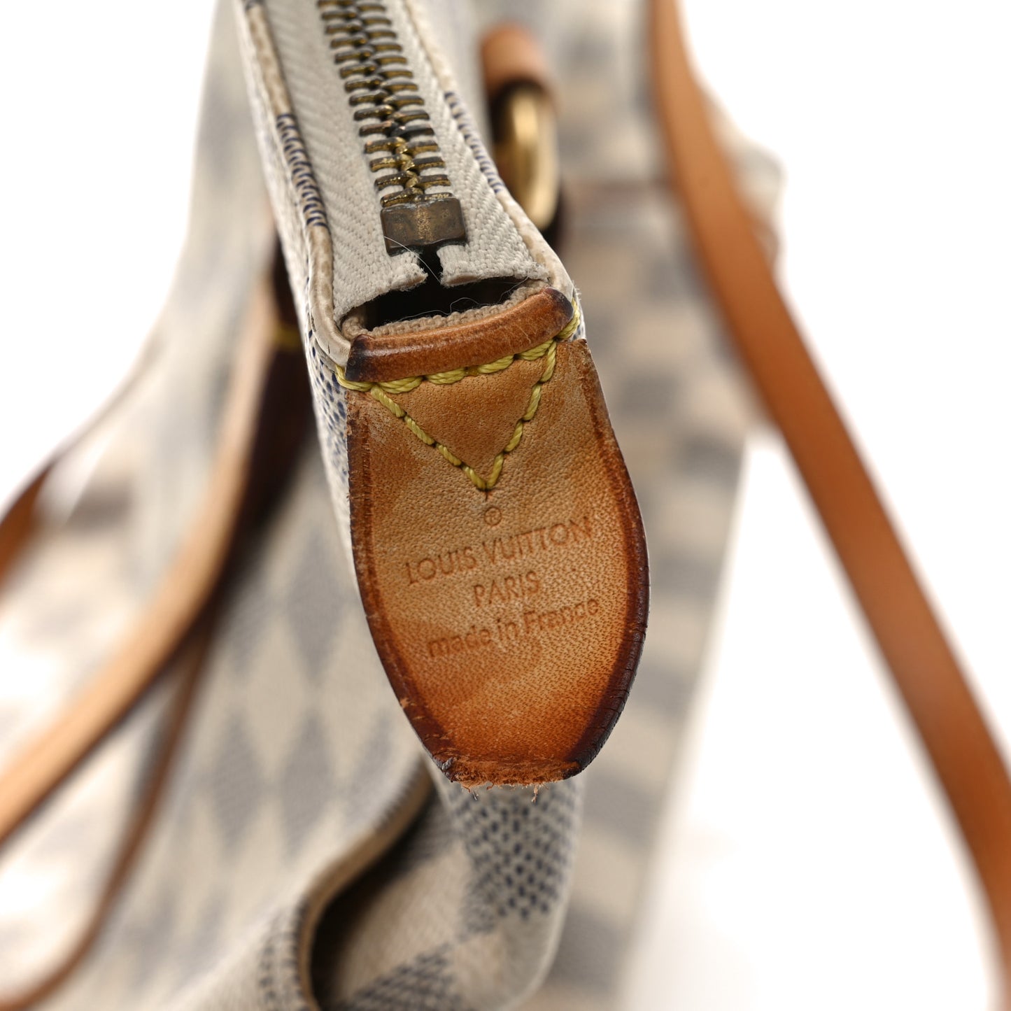 Handle: Edge wear, scuffs, wear at resin glazing, peeling, patina of vachetta, liquid marks