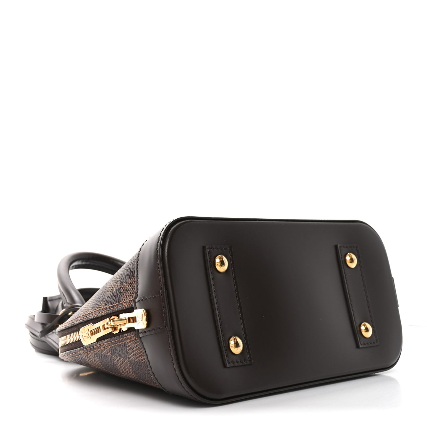 This is an authentic LOUIS VUITTON Damier Ebene Alma BB. This mini bowling-style handbag is crafted of Louis Vuitton's signature Damier coated canvas in brown. The bag features beautiful brown cowhide leather trim including a solid base, rolled top handles, an optional shoulder strap and brass hardware. The wrap-around zippers open to a red fabric interior with a patch pocket.Follow this item for alerts. Louis Vuitton is a registered trademark of Louis Vuitton. FASHIONPHILE is not affiliated with Louis Vuitton.