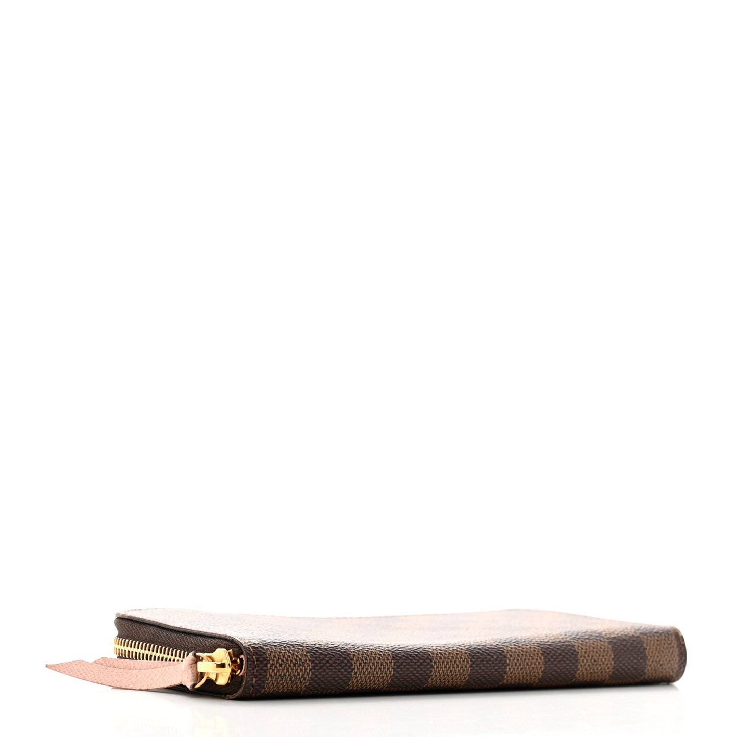 This is an authentic LOUIS VUITTON Damier Ebene Clemence Wallet in Rose Ballerine. The wallet is crafted of traditional damier ebene toile canvas. The wallet opens with a polished brass wrap-around zipper to a partitioned light pink cross-grain leather interior with card slots, bill compartments, and a central zipper pocket.Follow this item for alerts. Louis Vuitton is a registered trademark of Louis Vuitton. FASHIONPHILE is not affiliated with Louis Vuitton.