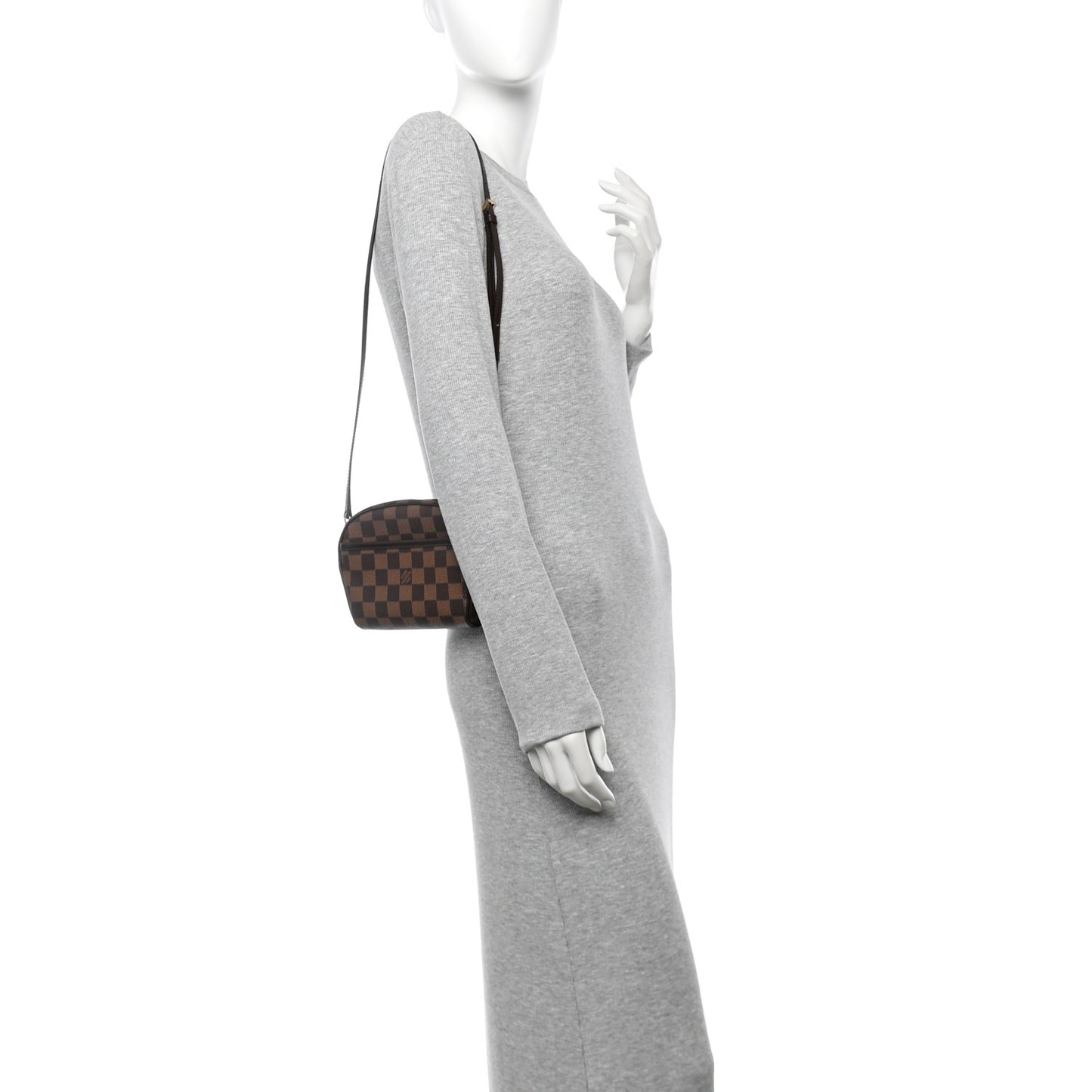 This is an authentic LOUIS VUITTON Damier Ebene Pochette Ipanema. This stylish bag is crafted of Louis Vuitton's signature checkerboard coated canvas in dark brown. The bag features a dark brown leather strap, matching trim, and brass hardware. The top zipper opens to an orange microfiber interior.Follow this item for alerts. Louis Vuitton is a registered trademark of Louis Vuitton. FASHIONPHILE is not affiliated with Louis Vuitton.