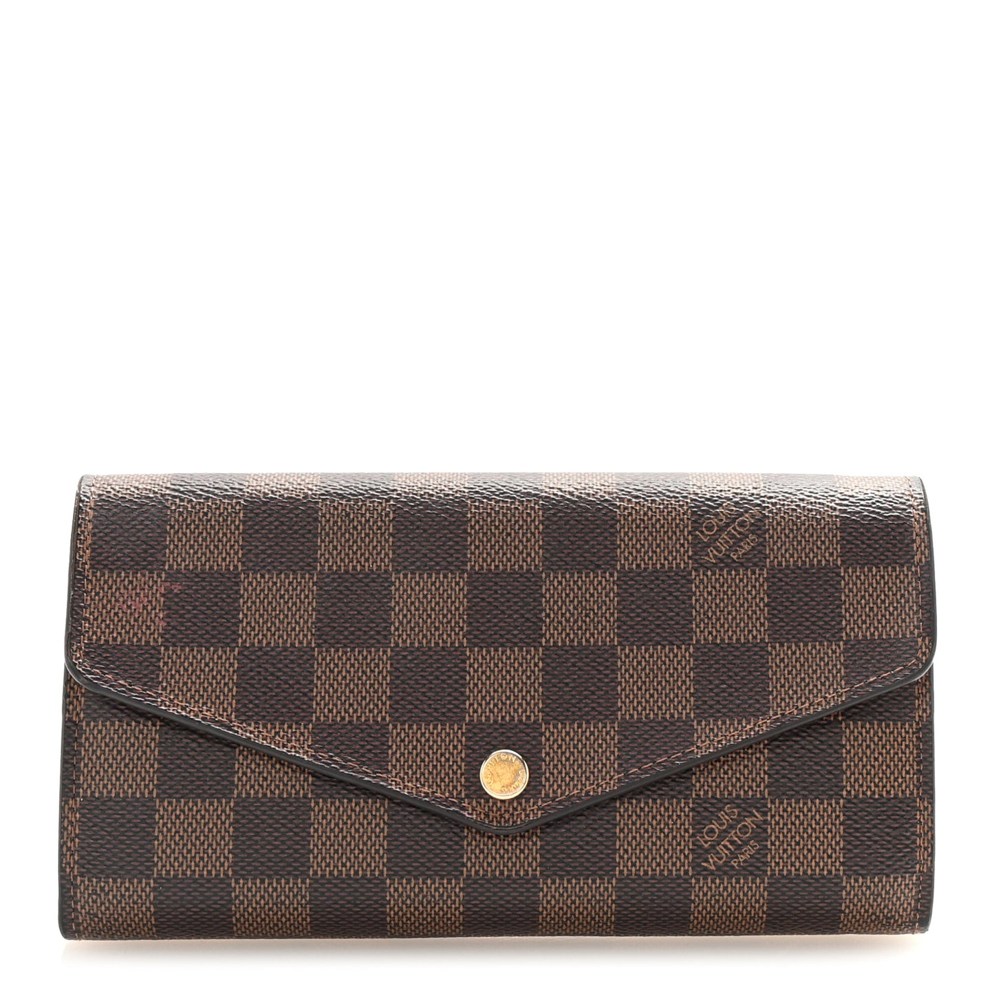 This is an authentic LOUIS VUITTON Damier Ebene Sarah Wallet NM in Rose Ballerine. This wallet is crafted of Louis Vuitton's checkerboard coated canvas in brown with pink crossgrain leather trim. It features a rear slip pocket and a front envelope-style flap that unsnaps to a partitioned pink crossgrain leather interior with card slots, patch pockets, and a zippered compartment.Follow this item for alerts. Louis Vuitton is a registered trademark of Louis Vuitton. FASHIONPHILE is not affiliated with Louis Vuitton.