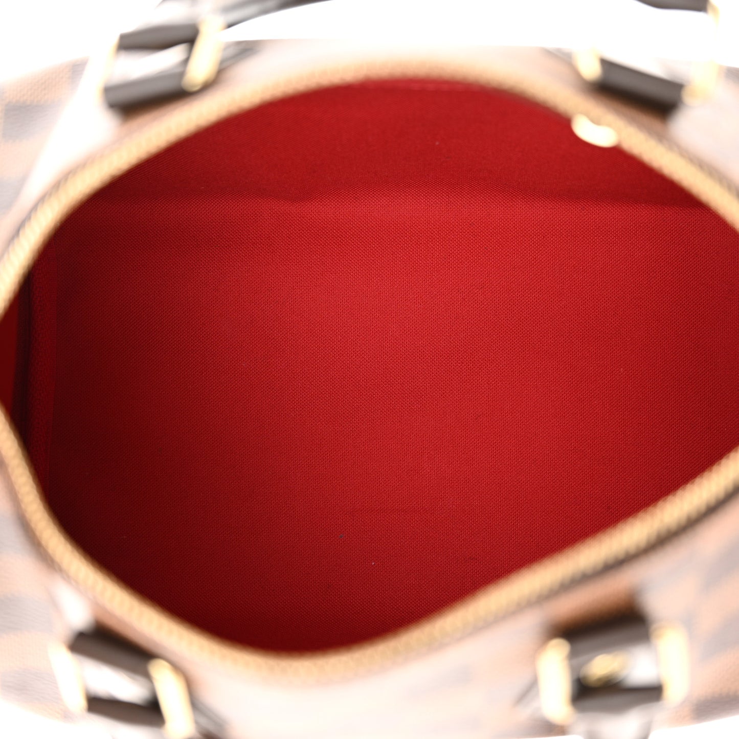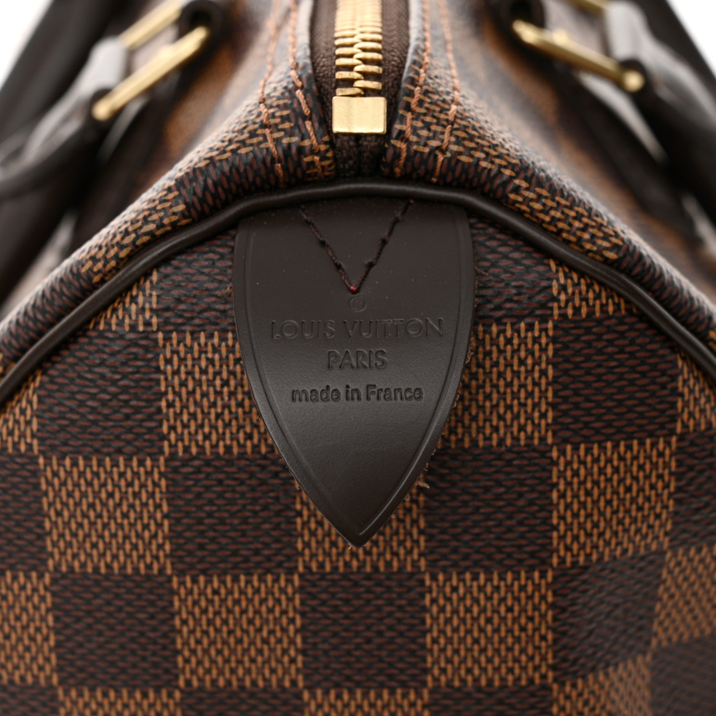 This is an authentic LOUIS VUITTON Damier Ebene Speedy 25. This stylish handbag is finely crafted of signature Louis Vuitton Damier patterned canvas in brown. The handbag features brown rolled leather top handles and brass hardware. The top zipper opens to a red fabric interior with a hanging zipper pocket.Follow this item for alerts. Louis Vuitton is a registered trademark of Louis Vuitton. FASHIONPHILE is not affiliated with Louis Vuitton.