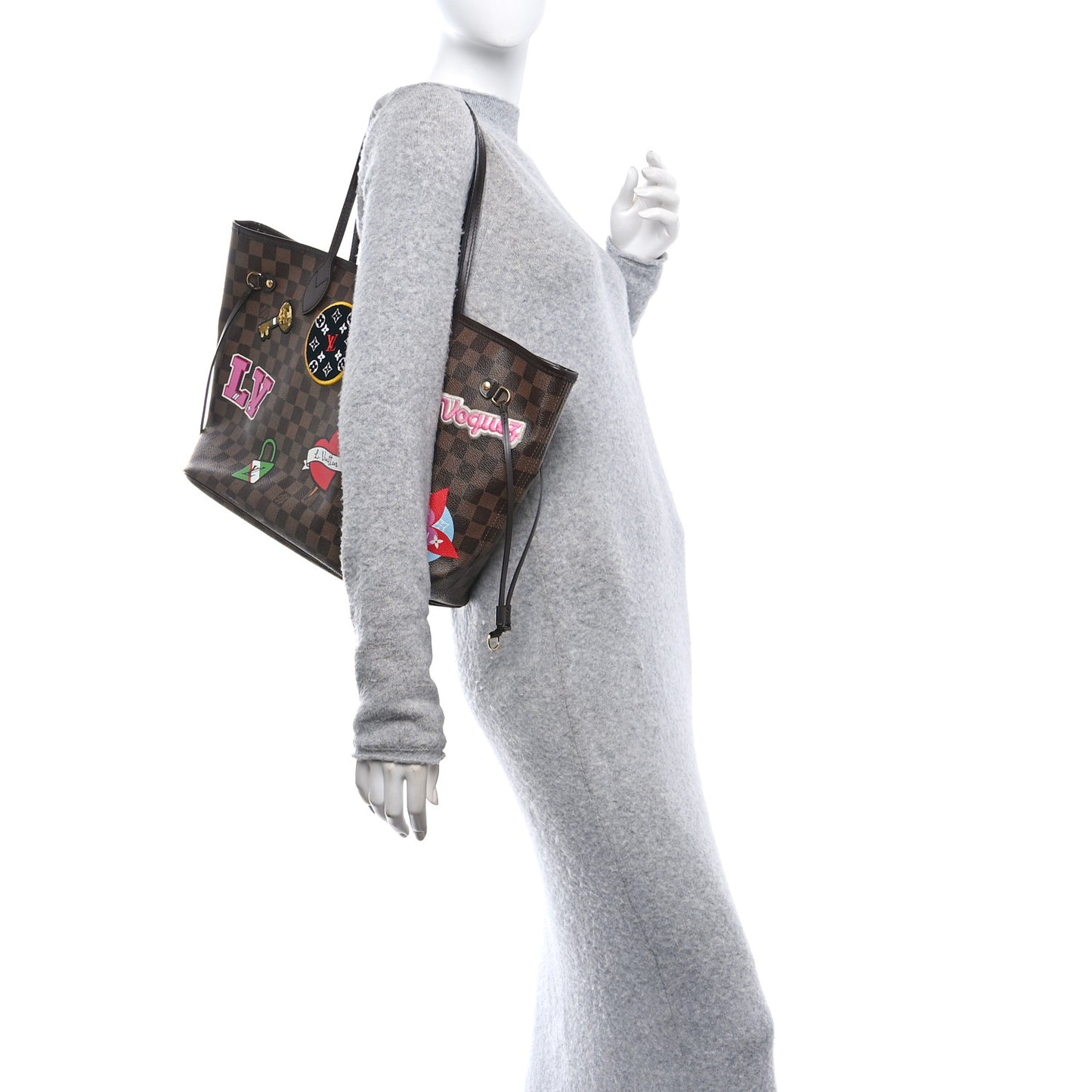 This is an authentic LOUIS VUITTON Damier Ebene Travel Stickers Neo Neverfull MM. This chic handbag is crafted of classic Louis Vuitton Damier checkered coated canvas with printed stickers and embroidered, microfiber, and sequined patches inspired by Louis Vuitton's travel heritage. The tote features dark brown leather handles and trim, and polished brass hardware. The top is open to an interior of rouge red striped fabric with a hanging zipper pocket.Follow this item for alerts. Louis Vuitton is a registered trademark of Louis Vuitton. FASHIONPHILE is not affiliated with Louis Vuitton.
