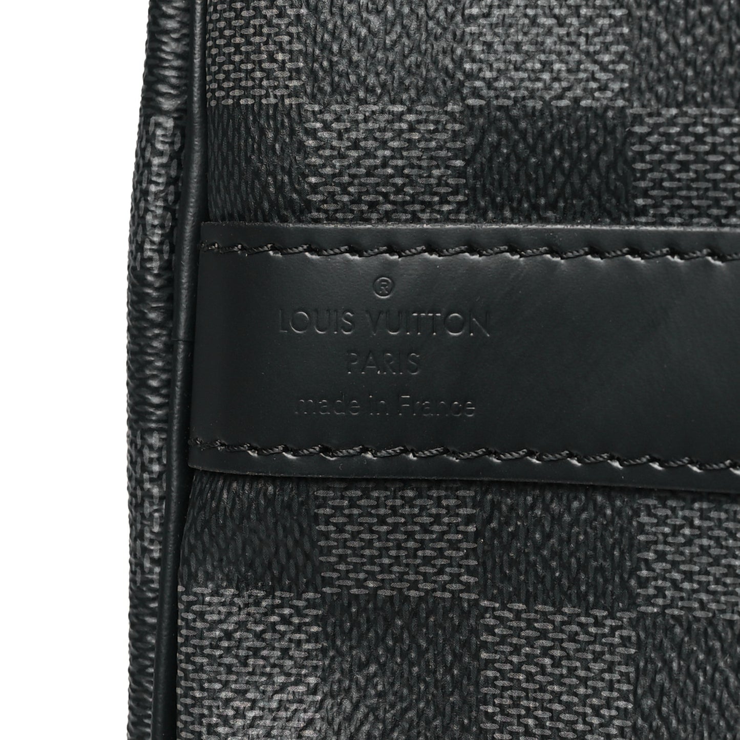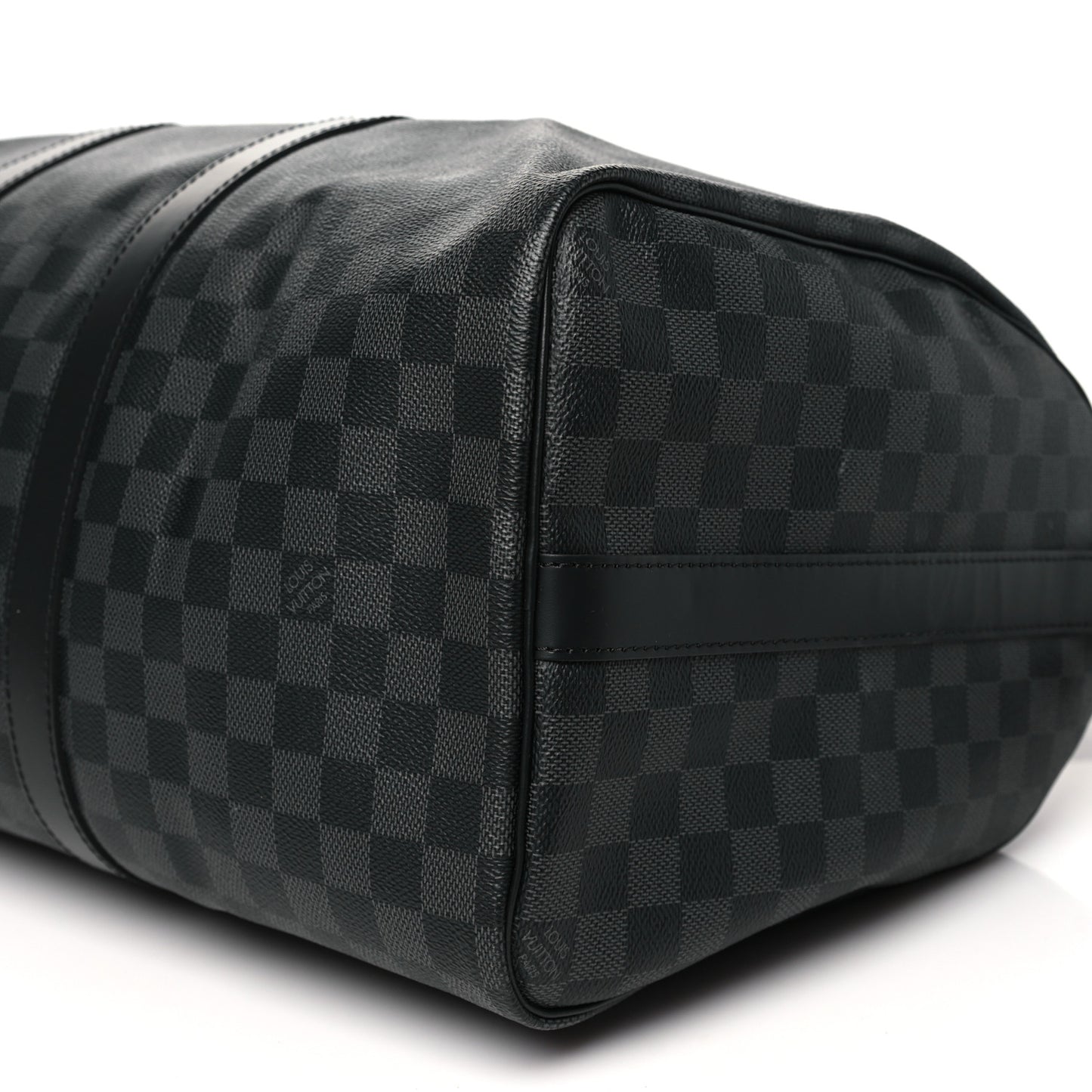 This is an authentic LOUIS VUITTON Damier Graphite Keepall Bandouliere 45. This travel bag is crafted of signatur graphite Damier coated canvas, black leather trim and silver hardware. This bag features black rolled leather top handles and an optional adjustable leather strap. The top opens to a black fabric interior with a zipper pocket.Follow this item for alerts. Louis Vuitton is a registered trademark of Louis Vuitton. FASHIONPHILE is not affiliated with Louis Vuitton.