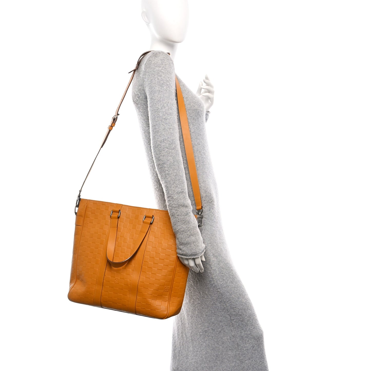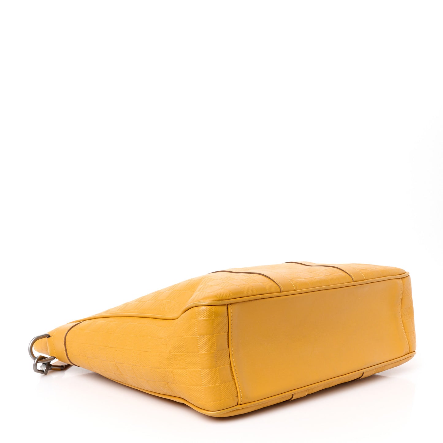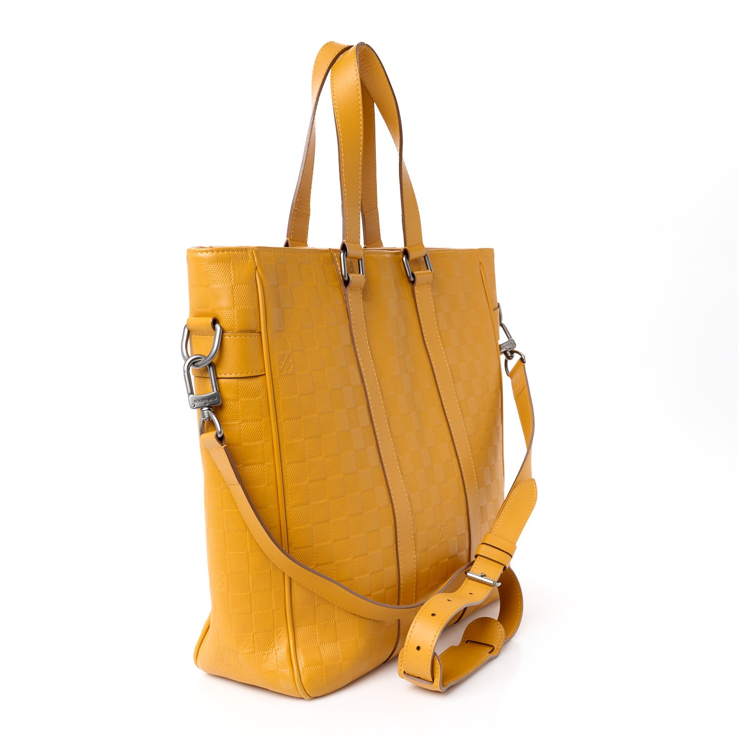 This is an authentic LOUIS VUITTON Damier Infini Tadao in Solar. This stylish tote is crafted of Louis Vuitton signature damier check embossed leather in golden yellow. The bag features leather strap top handles with matte dark silver links and an optional shoulder strap with matching clasps. The top zipper opens to a dark brown fabric interior with pockets.Follow this item for alerts. Louis Vuitton is a registered trademark of Louis Vuitton. FASHIONPHILE is not affiliated with Louis Vuitton.