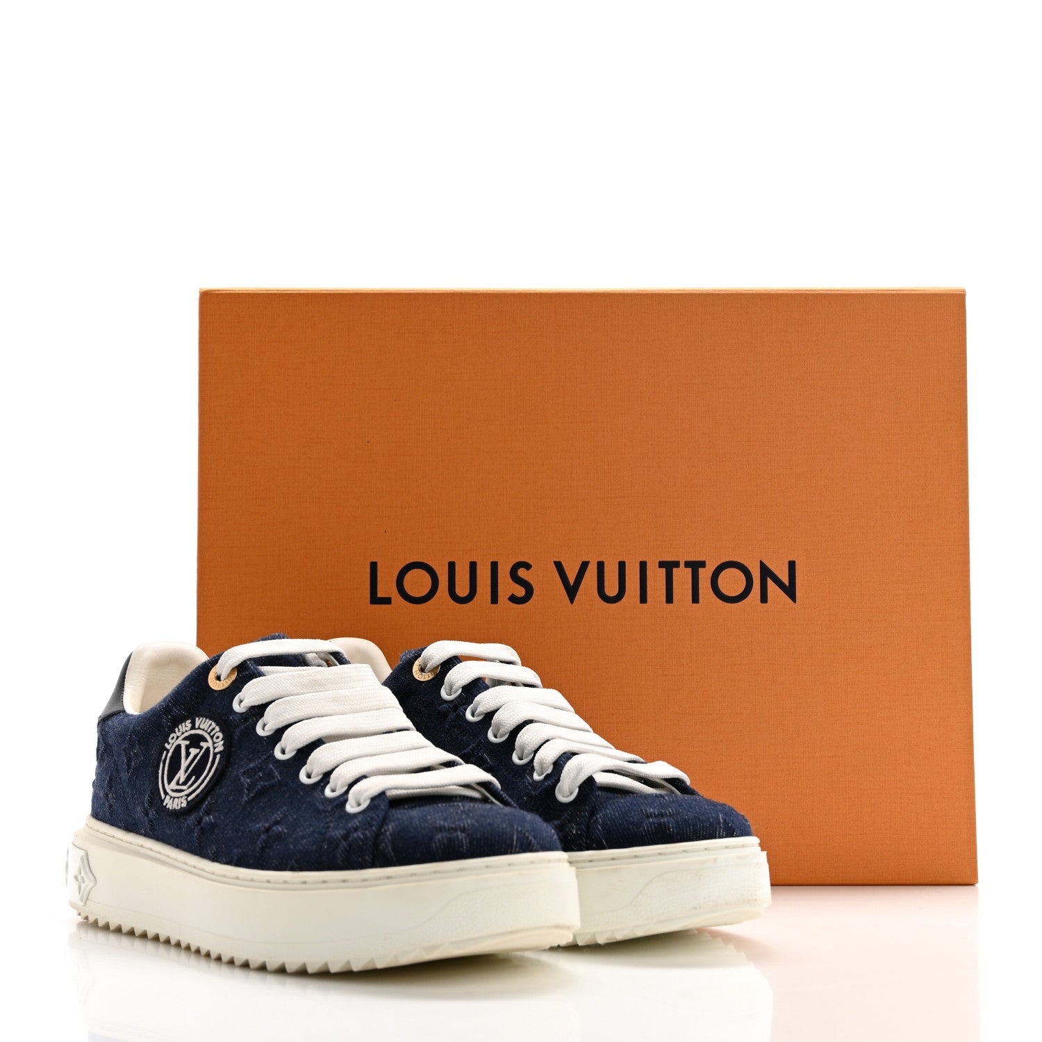 This is an authentic pair of LOUIS VUITTON Denim Monogram Debossed Time Out Sneakers size 38 in Blue. These stylish sneakers are crafted of dark blue monogram debossed denim. They feature thick white rubber soles and a blue leather heel cap.Follow this item for alerts. Louis Vuitton is a registered trademark of Louis Vuitton. FASHIONPHILE is not affiliated with Louis Vuitton.