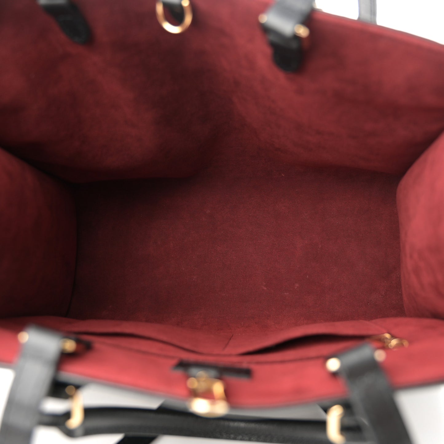 This is an authentic LOUIS VUITTON Empreinte Monogram Giant Onthego MM in Black and Beige. This limited edition tote is crafted of oversized Louis Vuitton monogram print embossed in ivory on black calfskin leather. The bag features rolled leather top handles, long shoulder straps, and gold hardware. The top is open to a spacious burgundy microfiber interior with zipper and patch pockets.Follow this item for alerts. Louis Vuitton is a registered trademark of Louis Vuitton. FASHIONPHILE is not affiliated with Louis Vuitton.