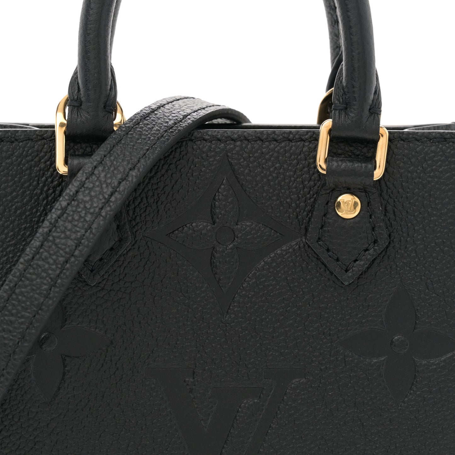 This is an authentic LOUIS VUITTON Empreinte Monogram Giant Petit Sac Plat in Black. The bag features rolled and reinforced black leather top handles, an optional adjustable shoulder strap, and polished gold hardware. The top of the bag is open to a black suede interior with a hanging patch pocket.Follow this item for alerts. Louis Vuitton is a registered trademark of Louis Vuitton. FASHIONPHILE is not affiliated with Louis Vuitton.