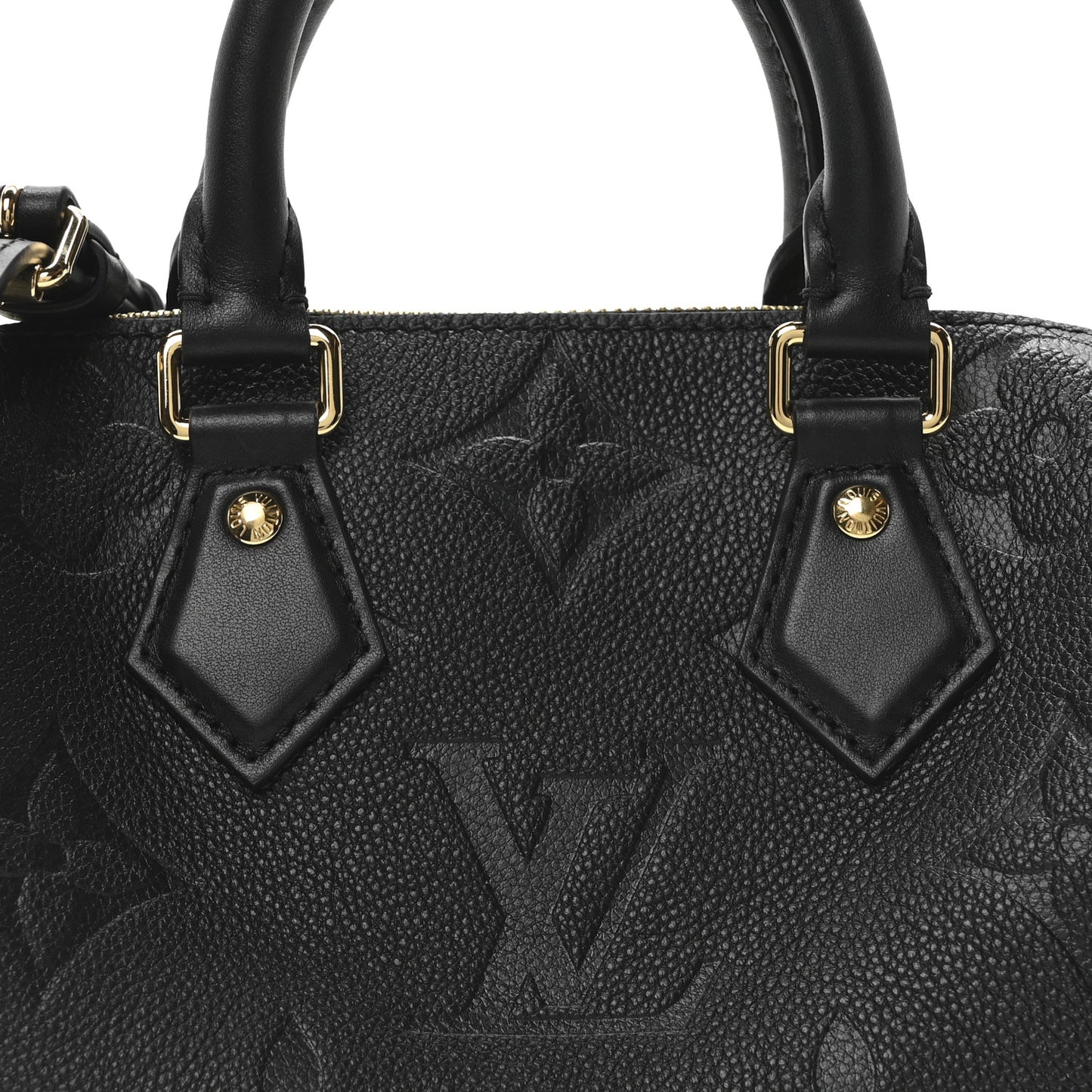 This is an authentic LOUIS VUITTON Empreinte Monogram Giant Speedy Bandouliere 20 in Black. This classic tote is crafted of oversized empreinte in black. The bag features rolled leather top handles, and an optional, adjustable shoulder strap with polished gold hardware. The top zippers open to a black microfiber interior with zipper and patch pockets.Follow this item for alerts. Louis Vuitton is a registered trademark of Louis Vuitton. FASHIONPHILE is not affiliated with Louis Vuitton.
