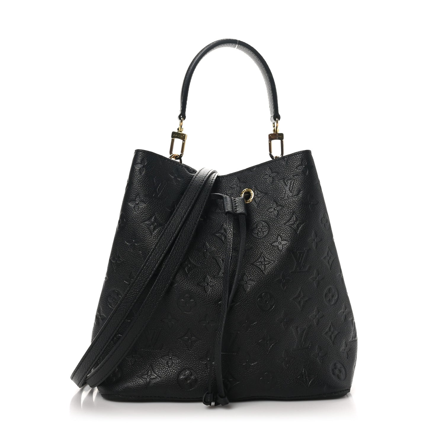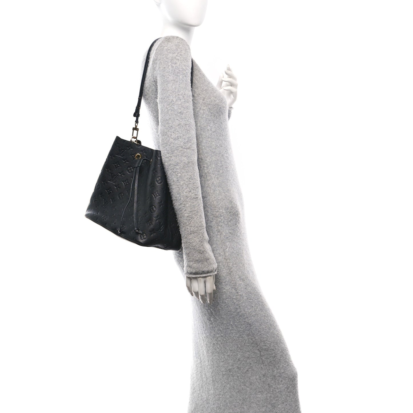 This is an authentic LOUIS VUITTON Empreinte Neonoe MM in Black. This classic bucket style shoulder bag is crafted of black leather with the Louis Vuitton monogram. The bag features a removable black shoulder strap, an optional top handle strap, top cinch strap, and polished brass hardware. This opens to a black microfiber interior with a central zipper compartment.Follow this item for alerts. Louis Vuitton is a registered trademark of Louis Vuitton. FASHIONPHILE is not affiliated with Louis Vuitton.