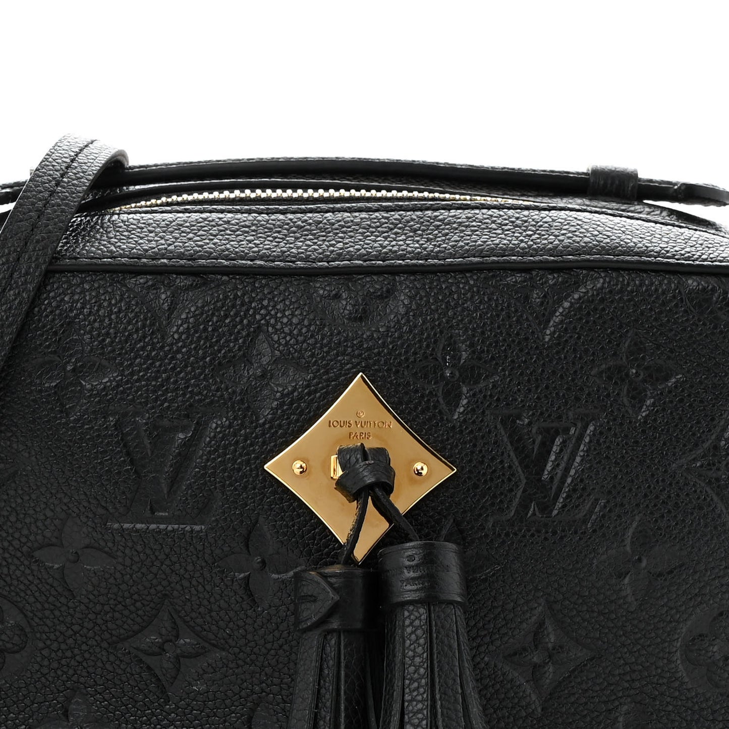 This is an authentic LOUIS VUITTON Empreinte Saintonge in Black. This petite shoulder bag is crafted of signature Louis Vuitton empreinte leather in black. It features a facing polished brass plate, adorned with two leather tassels. The bag has a sturdy leather top handle, and an adjustable shoulder strap with polished brass hardware. The wrap-around zippers opens to a black fabric interior with a patch pocket.Follow this item for alerts. Louis Vuitton is a registered trademark of Louis Vuitton. FASHIONPHILE is not affiliated with Louis Vuitton.