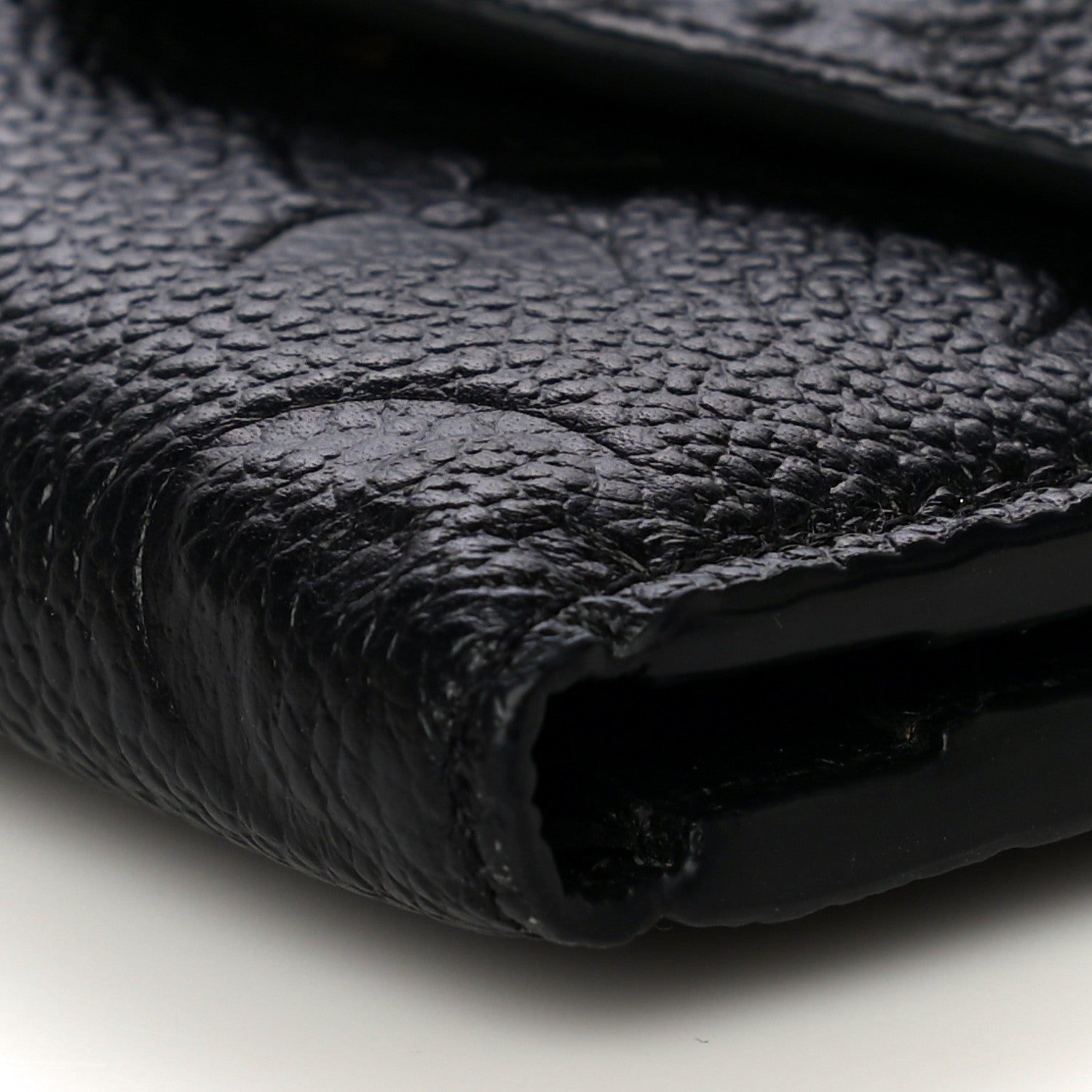 This is an authentic LOUIS VUITTON Empreinte Zoe Wallet in Black. This chic wallet is crafted of monogram-embossed calfskin leather in black. The wallet features a front flap that opens with a polished brass snap to a matching leather interior lined with card slots, billfold, and a zipper pocket.Follow this item for alerts. Louis Vuitton is a registered trademark of Louis Vuitton. FASHIONPHILE is not affiliated with Louis Vuitton.
