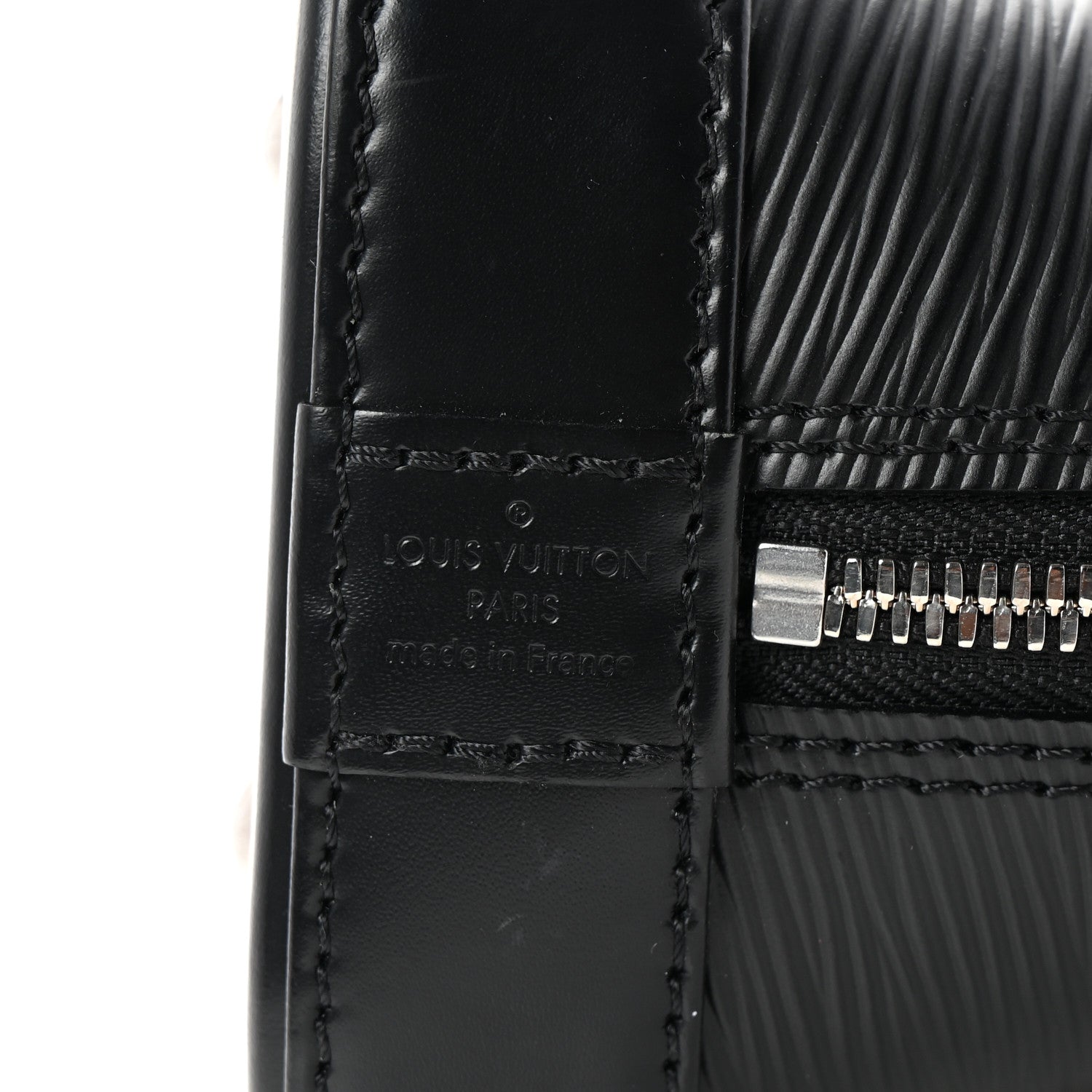 This is an authentic LOUIS VUITTON Epi Alma BB in Black. This stylish handbag is crafted of Louis Vuitton's signature textured epi leather in black. This classic mini handbag features rolled leather top handles, an optional shoulder strap, and polished silver hardware. The top opens to a grey fabric interior with a patch pocket.Follow this item for alerts. Louis Vuitton is a registered trademark of Louis Vuitton. FASHIONPHILE is not affiliated with Louis Vuitton.