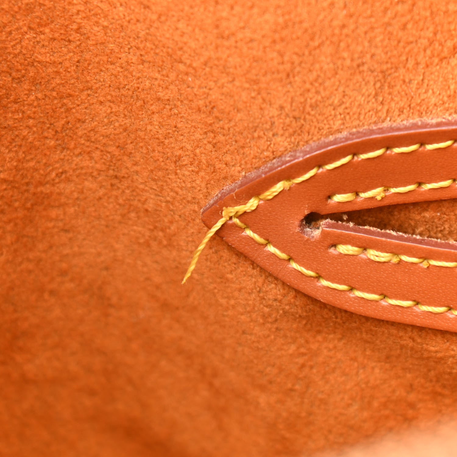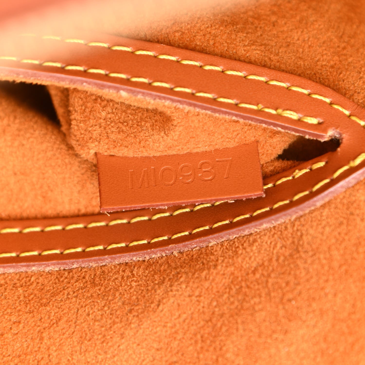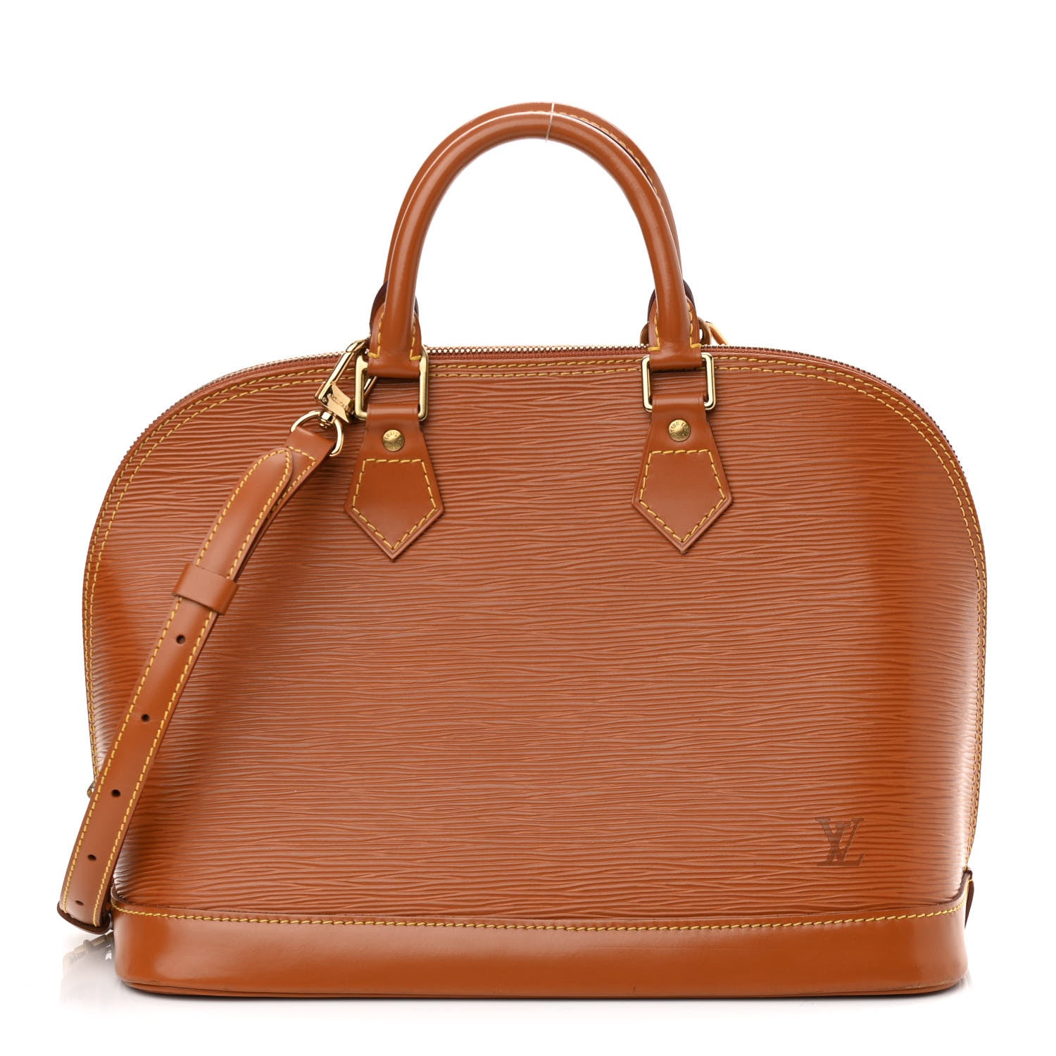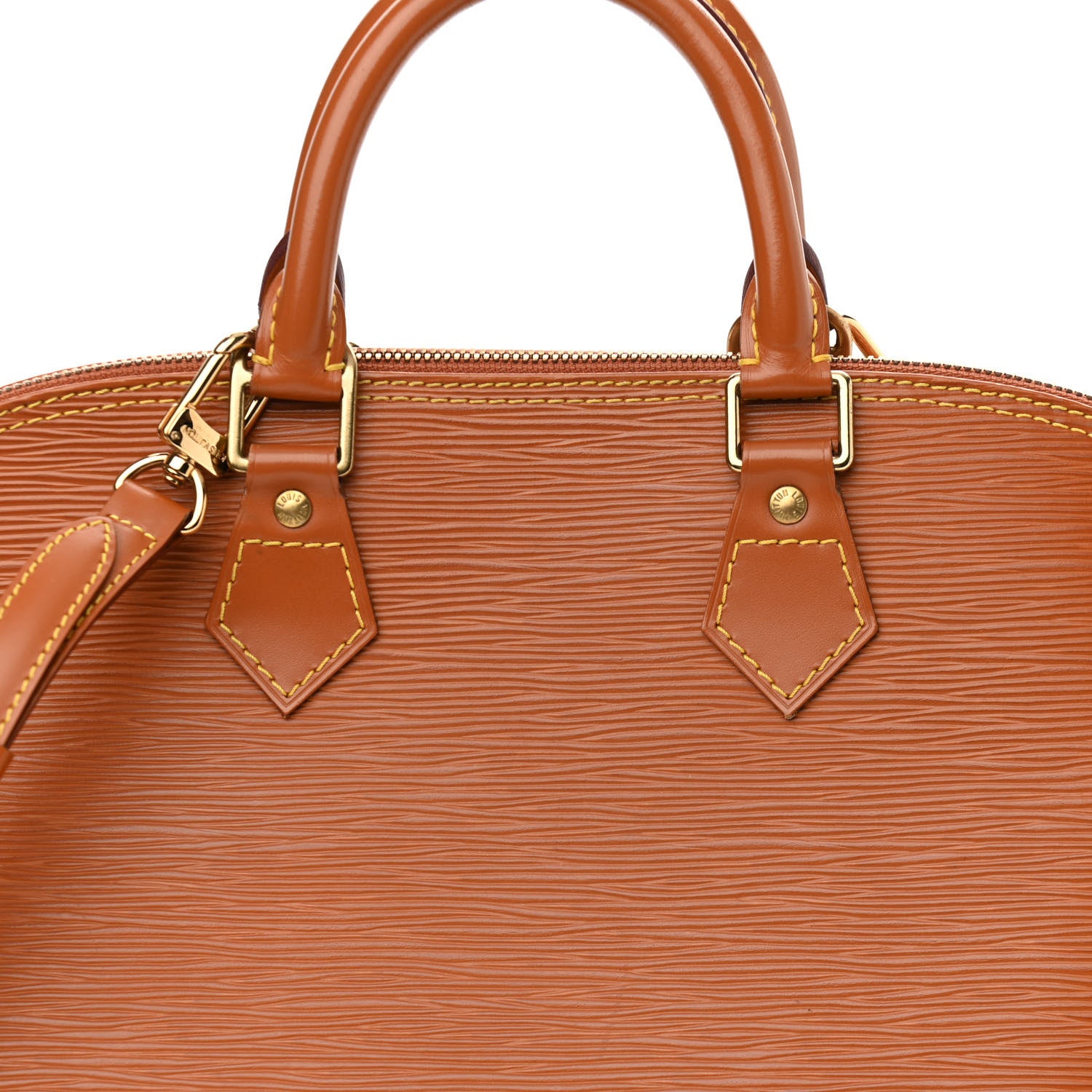 This is the authentic LOUIS VUITTON Epi Alma PM in Cipango. This handbag is crafted of Louis Vuitton's signature textured epi leather in light brown. This bag features smooth cowhide rolled leather top handles, adjustable leather shoulder strap and brass hardware. The top zipper opens to a matching brown microfiber interior with a pocket.Follow this item for alerts. Louis Vuitton is a registered trademark of Louis Vuitton. FASHIONPHILE is not affiliated with Louis Vuitton.