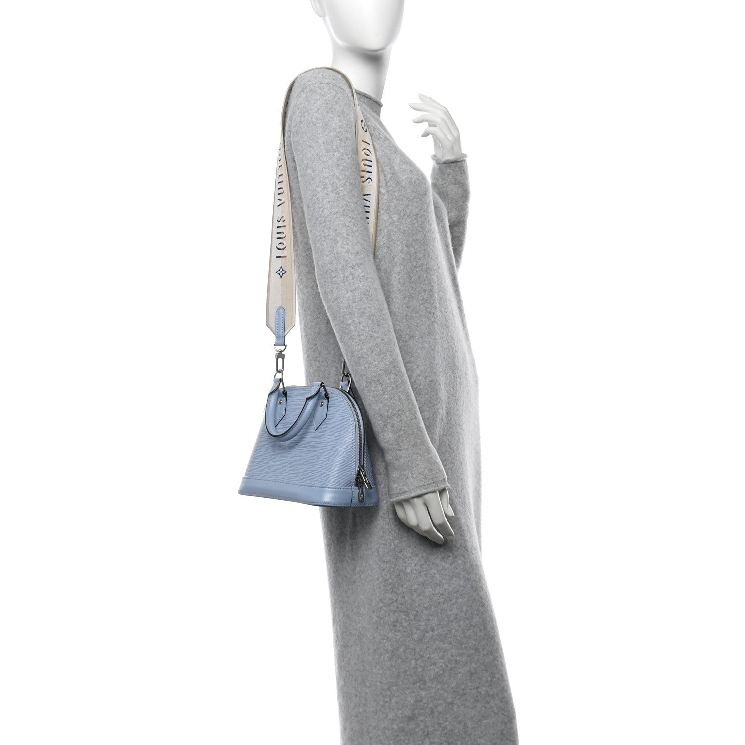 This is an authentic LOUIS VUITTON Epi Alma BB in Bleu Nuage. This stylish tote is crafted of Louis Vuitton's signature textured epi leather in light blue. This classic mini handbag features an optional adjustable strap, matching rolled leather top handles and polished silver hardware. The top zippers opens to a blue microfiber interior with a small patch pocket.Follow this item for alerts. Louis Vuitton is a registered trademark of Louis Vuitton. FASHIONPHILE is not affiliated with Louis Vuitton.