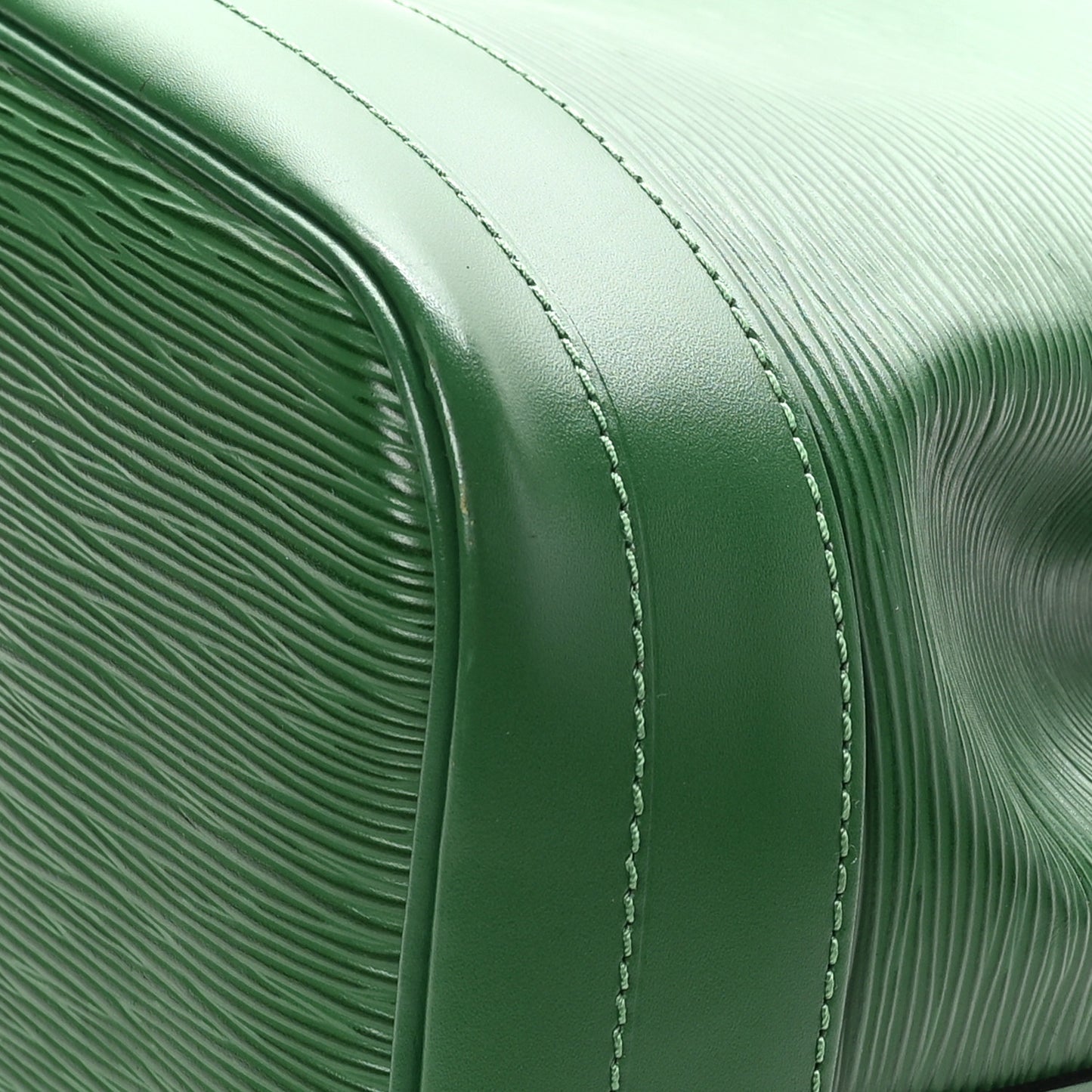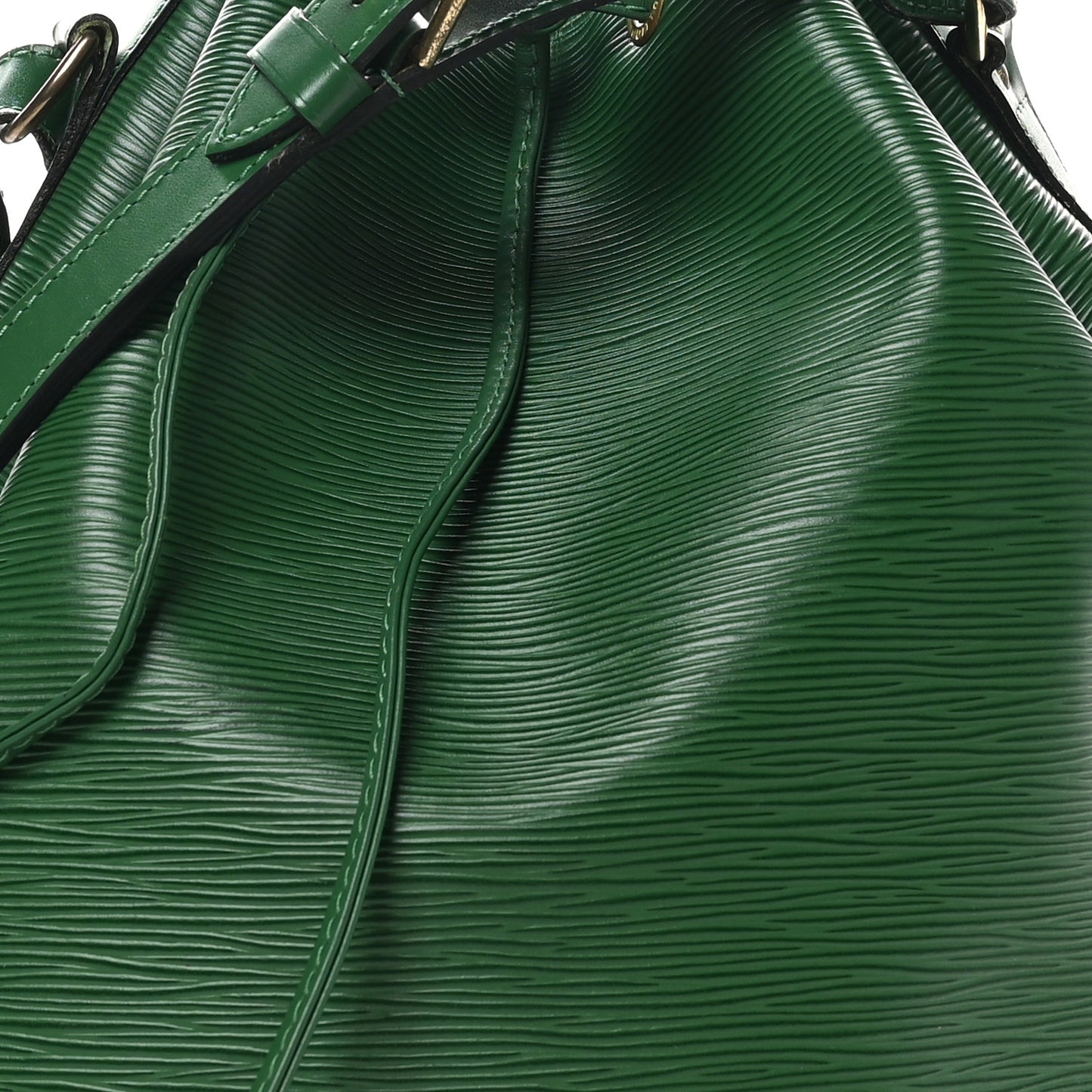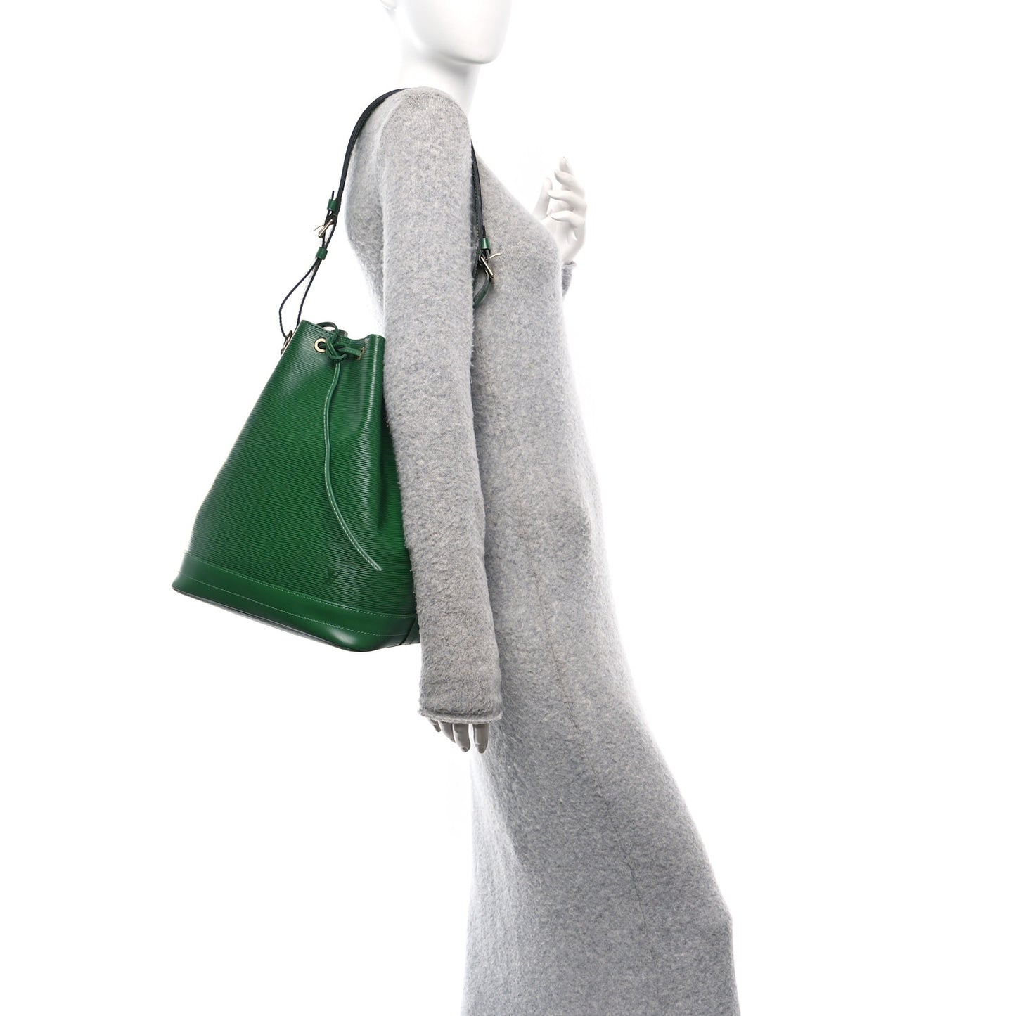 This is an authentic LOUIS VUITTON Epi Noe in Borneo. This chic shoulder bag is crafted of Louis Vuitton signature textured epi leather in green. The bag features a leather cinch cord with brass eyelets and an adjustable smooth leather shoulder strap with a brass buckle. The top is open to a black microfiber interior with a zipper pocket.Follow this item for alerts. Louis Vuitton is a registered trademark of Louis Vuitton. FASHIONPHILE is not affiliated with Louis Vuitton.